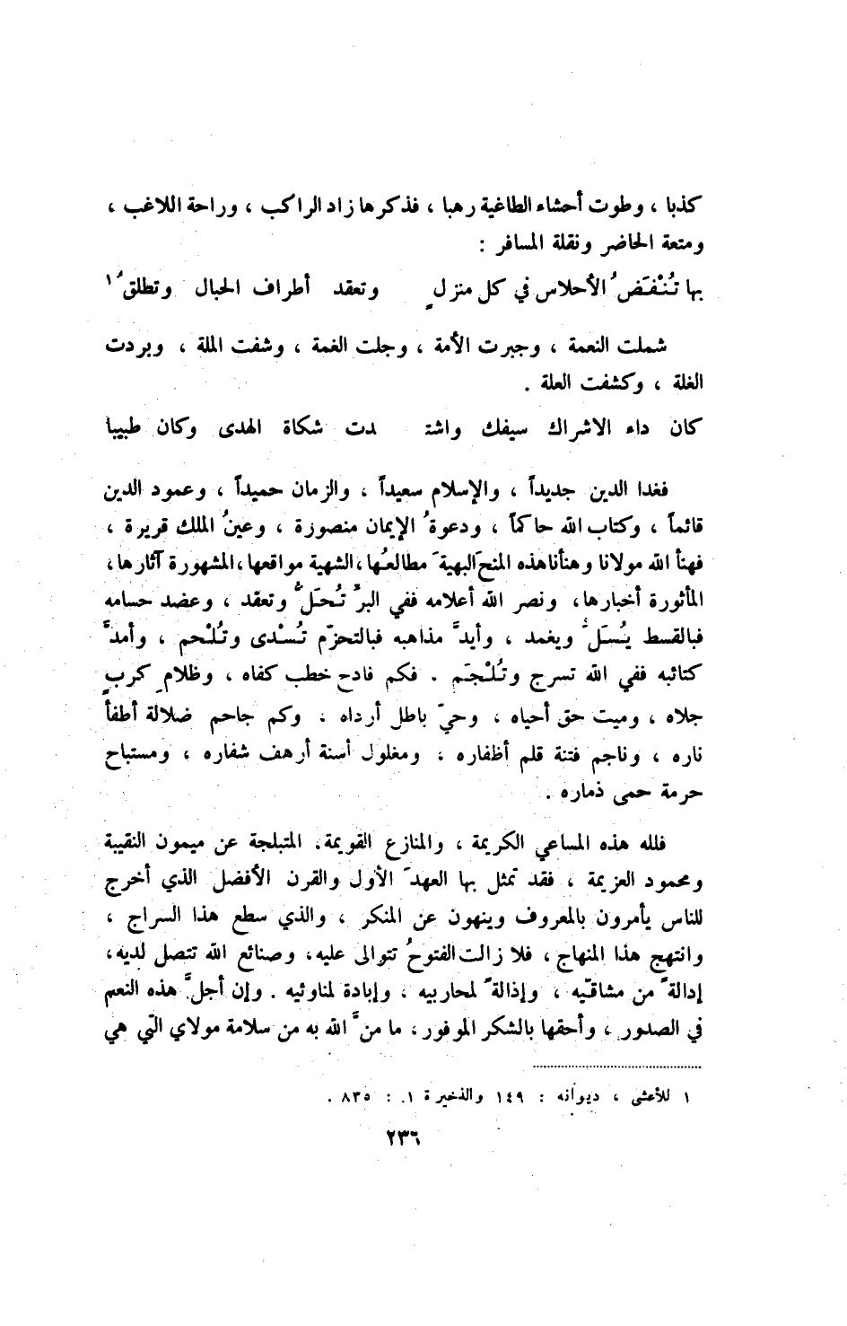 كان داء الإشراك سيفك واشت ... دت شكاة الهدى وكان طبيبا فغدا الدين جديداً، والإسلام سعيداً، والزمان حميداً، وعمود الدين قائماً، وكتاب الله حاكماً، ودعوة الإيمان منصورة، وعين الملك قريرة، فهنأ الله مولانا وهنأنا هذه المنح البهية مطالعها، الشهية مواقعها، المشهورة آثارها، المأثورة أخبارها، ونصر الله أعلامه ففي البر تحل وتعقد، وعضد حسامه فبالقسط يسل ويغمد، وأيد مذاهبه فبالتحزم تسدى وتلحم، وأمد كتائبه ففي الله تسرج وتلجم، فكم فادح خطب كفاه، وظلام كرب جلاه، وميت حق أحياه، وحي باطل أرداه، وكم جاحم ضلالة أطفأ ناره، وناجم فتنة قلم أظفاره، ومغلول أسنة أرهف شفاره، ومستباح حرمة حمى ذماره.