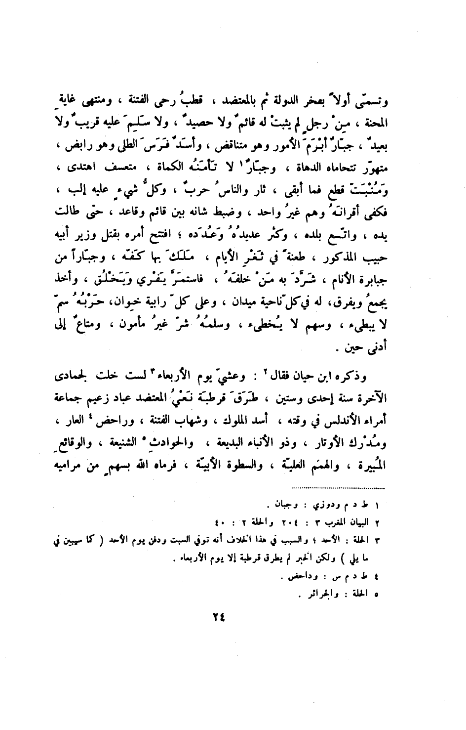 وتسمى أولاً بفخر الدولة ثم المعتضد، قطب رحى الفتنة، ومنتهى غاية المحنة، من رجل لم يثبت له قائم ولا حصيد، ولا سلم عليه قريب ولا بعيد، جبار أبرم الأمور وهو متناقض، وأسد فرس الطلى وهو رابض، متهور تتحاماه الدهاة، وجبار لا تأمنه الكماو، متعسف اهتدى، ومنبت قطع فما أبقى، ثار والناس حرب، وكل شيءٍ عليه إلب، فكفى أقرانه وهم غير واحد، وضبط شانه بين قائم وقاعد، حتى طالت يده، واتسع بلده، وكثر عديده وعدده؛ افتتح أمره بقتل وزير أبيه حبيب المذكور، طعنةً في ثغر الأيام، ملك بها كفه، وجباراً من جبابرة الأنام، شرد به من خلفه، فاستمر يفري ويخلق، وأخذ يجمع ويفرق، له في كل ناحية ميدان، وعلى كل رابية خوان، حربه سم لا يبطئ، وسهم لا يخطئ، وسلمه شر غير مأمون، ومتاع إلى أدنى حين.