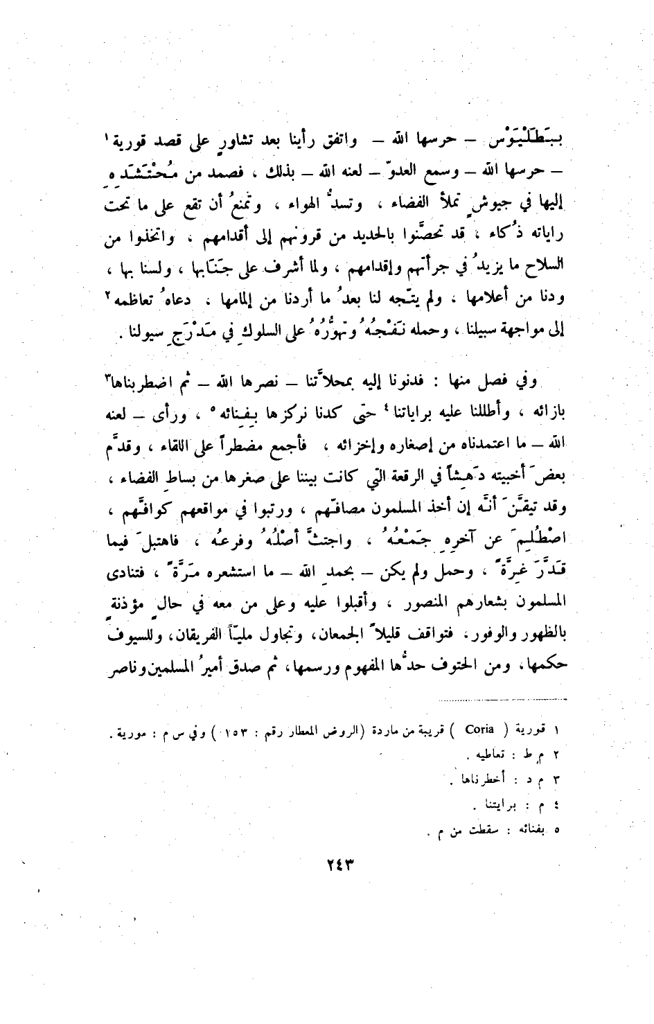 ببطليوس - حرسها الله - واتفق رأينا بعد تشاورٍ على قصد قورية - حرسها الله - وسمع العدو - لعنه الله - بذلك، فصمد من محتشده إليها في جيوش تملأ الفضاء، وتسد الهواء، وتمنع أن تقع على ما تحت راياته ذكاء، قد تحصنوا بالحديد من قرونهم إلى أقدامهم، واتخذوا السلاح ما يزيد في جرأتهم وإقدامهم، ولما أشرف على جنابها، ولسنا بها، ودنا من أعلامها، ولم يتجه لنا بعد ما أردنا من إلمامها، دعاه تعاظمه إلى مواجهة سبيلنا، وحمله نفجه وتهوره على السلوك في مدرج سيولنا.