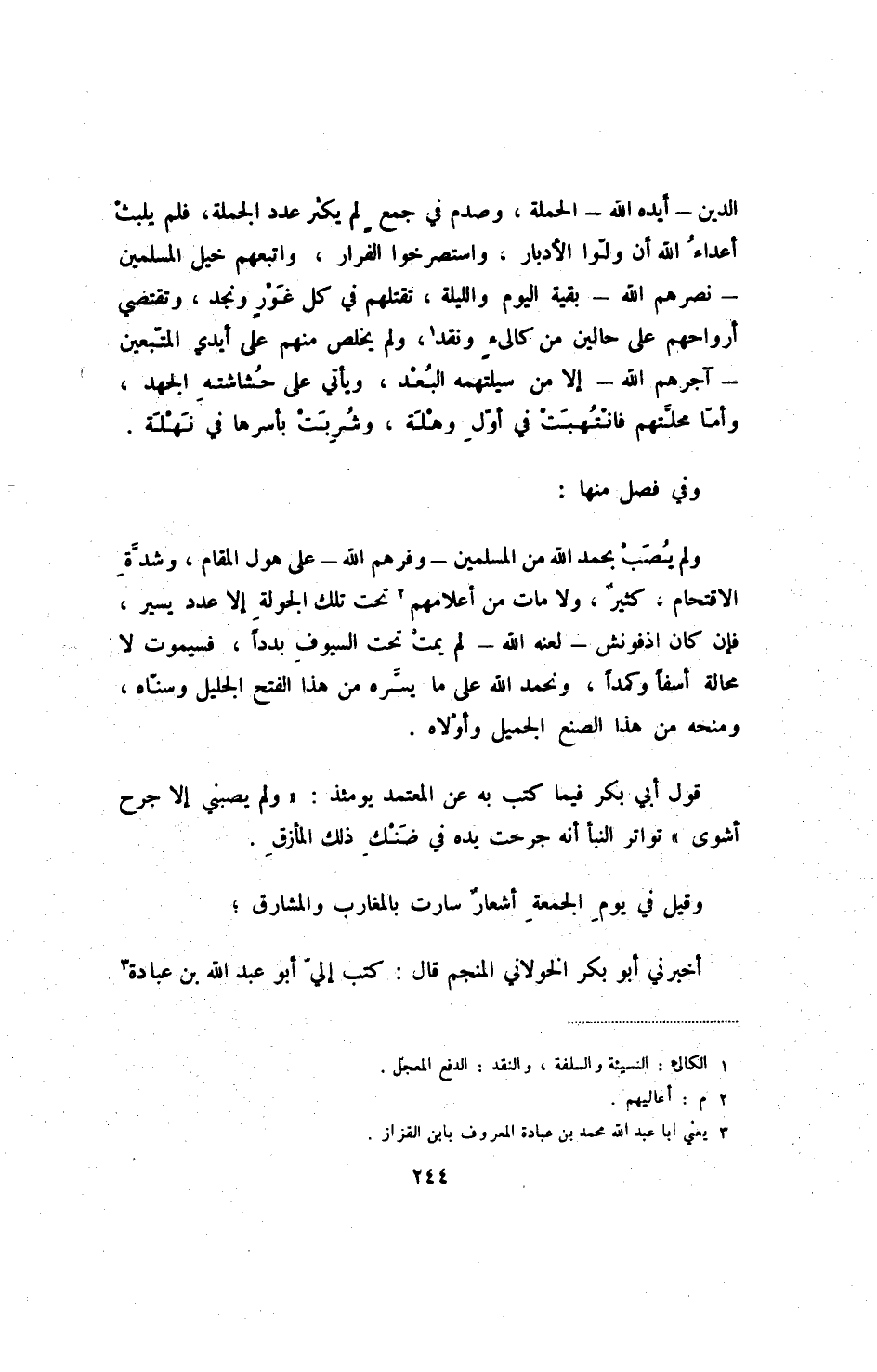 الدين - أيده الله - الحملة، وصدم في جمعٍ لم يكثر عدد الجملة، فلم يلبث أعداء الله أن ولوا الأدبار، واستصرخوا الفرار، واتبعهم خيل المسلمين - نصرهم الله - بقية اليوم والليلة، تقتلهم في كل غورٍ ونجد، وتقتضي أرواحهم على حالين من كالئ ونقد، ولم يخلص منهم على أيدي المتبعين - آجرهم الله - إلا من سيلتهمه البعد، ويأتي على حشاشته الجهد، وأما محلتهم فانتهبت في أول وهلة، وشربت بأسرها في نهلة.