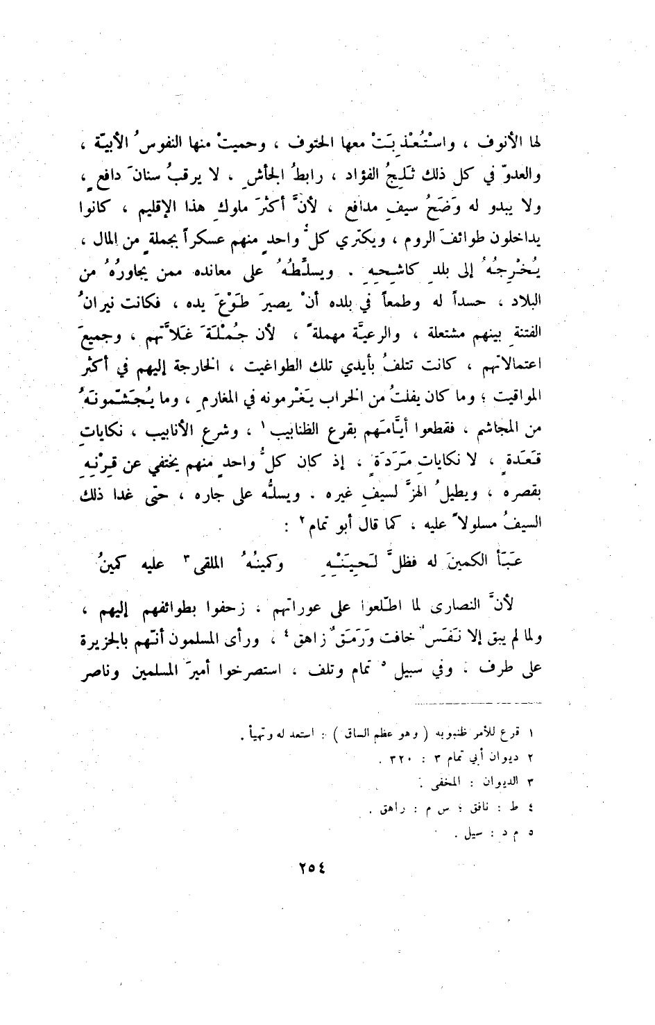 لها الأنوف، واستعذبت معها الحتوف، وحميت منها النفوس الأبية، والعدو في كل ذلك ثلج الفؤاد، رابط الجأش، لا يرقب سنان دافع، ولا يبدو له وضح سيف مدافع، لأن أكثر ملوك هذا الإقليم، كانوا يداخلون طوائف الروم، ويكتري كل واحد منهم عسكراً بجملة من المال، يخرجه إلى بلد كاشحه، ويسلطه على معانده ممن يجاوره من البلاد، حسداً له وطمعاً في بلده أن يصير طوع يده، فكانت نيران الفتنة بينهم مشتعلة، والرعية مهملةً، لأن جملة غلاتهم، وجميع اعتمالاتهم، كانت تتلف بأيدي تلك الطواغيت، الخارجة إليهم في أكثر المواقيت؛ وما كان يفلت من الخراب يغرمونهفي المغارم، وما يجشمونه من المجاشم، فقطعوا أيامهم بقرع الظنابيب، وشرع الأنابيب، نكايات قعدة، لا نكايات مردةٍ، إذ كان كل واحد منهم يختفي عن قرنه بقصره، ويطيل الهز لسيف غيره، ويسله على جاره، حتىغدا ذلك السيف مسلولاً عليه، كما قال أبو تمام: