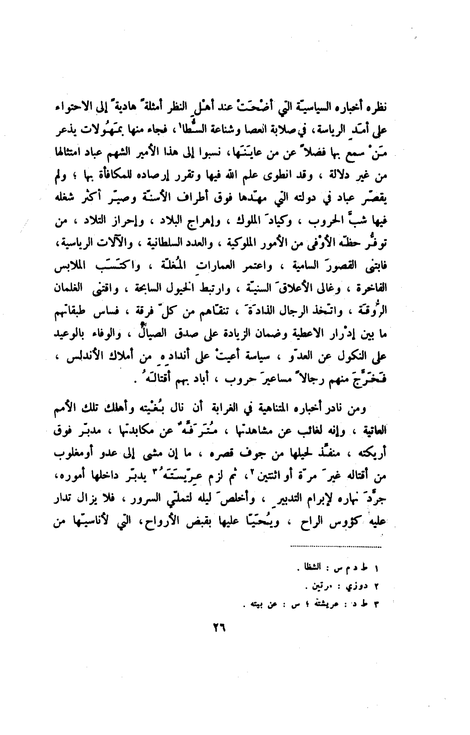 نظره أخباره السياسية التي أضحت عند أهل النظر أمثلة هاديةً إلى الاحتواء على أمد الرياسة، في صلابة العصا وشناعة السطا، فجاء منها بمهولات يذعر من سمع بها فضلاً عن من عاينها، نسبوا إلى هذا الأمير الشهم عباد امتثالها من غير دلالة، وقد انطوى علم الله فيها وتقرر إرصاده للمكافأة بها؛ ولم يقصر عباد في دولته التي مهدها فوق أطراف الأسنة وصير أكثر شغله فيها شب الحروب، وكياد الملوك وإهراج البلاد، وإحراز التلاد، من توفر حظه الأوفى من الأمور الملوكية، والعدد السلطانية، والآلات الرياسية، فابتنى القصور السامية، واعتمر العمارات المغلة، واكتسب الملابس الفاخرة، وغالى الأعلاق السنية، وارتبط الخيول السابحة، واقتنى الغلمان الروقة، واتخذ الرجال الذادة، تناقهم من كل فرقة، فساس طبقاتهم ما بين إدرار الأعطية وضمان الزيادة على صدق الصيال، والوفاء بالوعيد على النكول عن العدو، سياسة أعيت على أنداده من أملاك الأندلس، فخرج منهم رجالاً مساعير حروب، أباد بهم أقتاله.