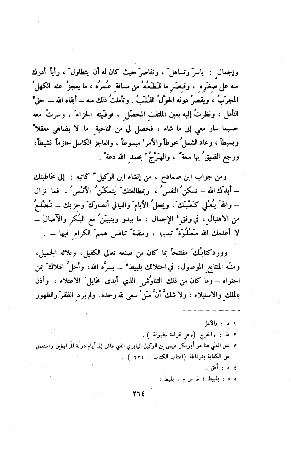 ومن جواب ابن صمادح، من إنشاء ابن الوكيل كاتبه: إلى مخاطبتك - أيدك الله - تسكن النفس، وبمطالعتك يتمكن الأنس. فما تزال - والله يعلي كعبك، ويجعل الأيام والليالي أنصارك وحزبك - تطلع من الاهتبال، في وفق الإجمال، ما يبدو ويتبين مع البكر والآصال - لا أعدمك الله معلوةً تبديها، ومنقبةً تنافس همم الكرام فيها -.