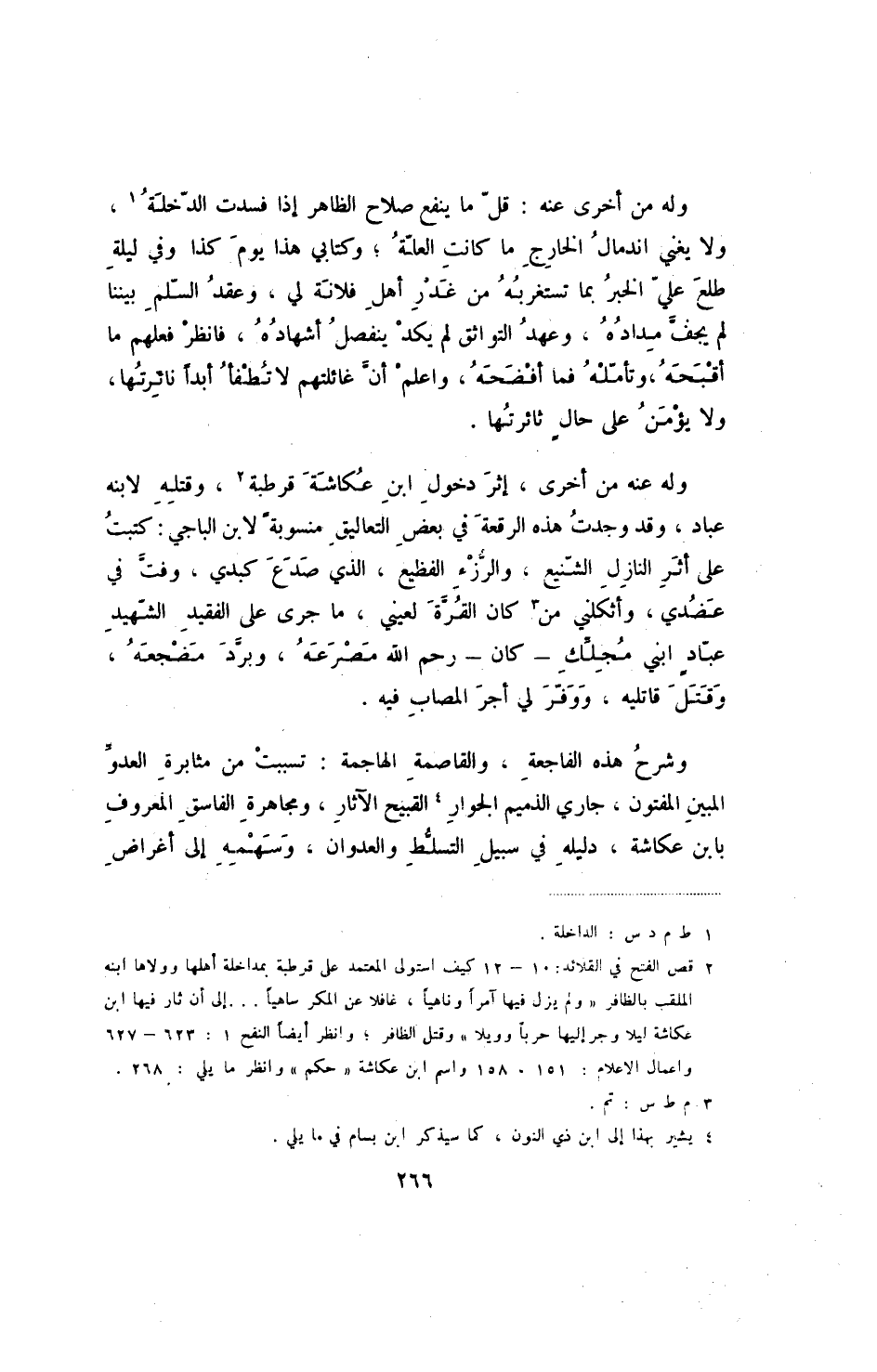 وله عنه من أخرى، إثر دخول ابن عكاشة قرطبة، وقتله لابنه عباد، وقد وجدت هذه الرقعة في بعض التعاليق منسوبة لابن الباجي: كتبت على أثر النازل الشنيع، والرزء الفظيع، الذي صدع كبدي، وفت في عضدي، وأثكلني من كان القرة لعيني، ما جرى على الفقيد الشهيد عباد ابني مجلك - كان - رحم الله مصرعه، وبرد مضجعه، وقتل قاتليه، ووفر لي أجر المصاب فيه.