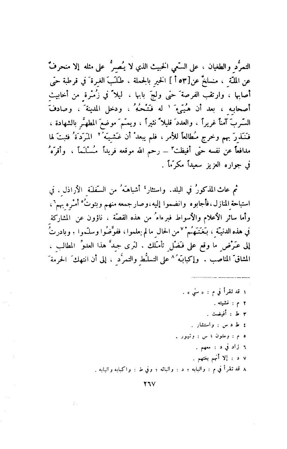 التمرد والطغيان، على السعي الخبيث الذي لا يصر على مثله إلا منحرف عن الملة، منسلخ عن [53أ] الخبر بالجملة، طلب الغرة في قرطبة حتى أصابها، وارتقب الفرصة حتى ولج بابها، ليلاً في زمرة من أخابيث أصحابه، بعد أن هيئ له فتحه، ودخل المدينة، وصادف السرب آمناً غريراً، والعدد قليلاً نثيراً، ويمم موضع المطهر بالشهادة، فنذر بهم وخرج مطالعاً للأمر، فلم يبعد أن غشيه المردة فثبت لها مدافعاً عن نفسه حتى أفيظت - رحم الله موقعه فريداً مسلماً، وأقره في جواره العزيز سعيداً مكرماً.