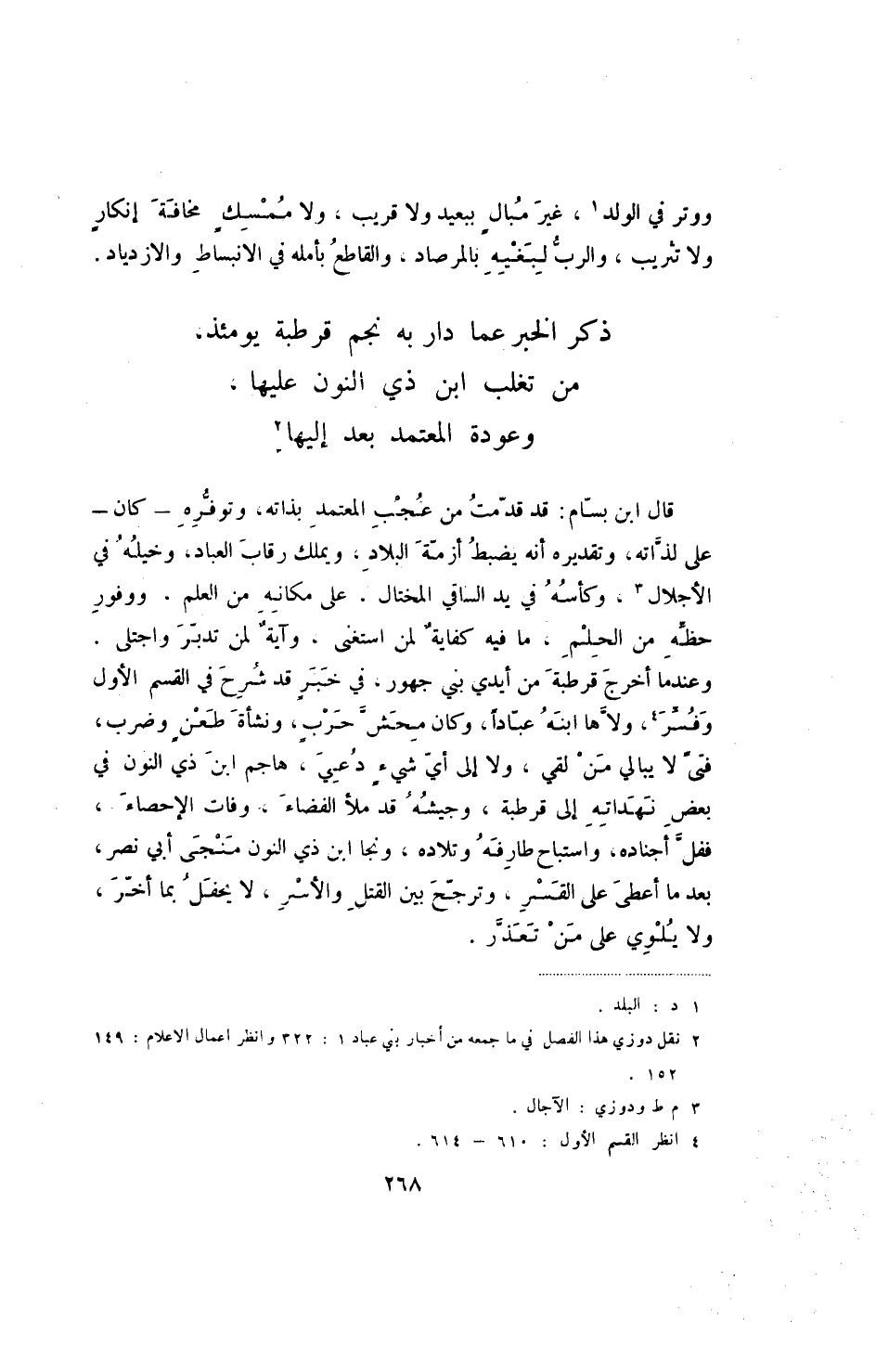 قال ابن بسام: قد قدمت من عجب المعتمد بذاته، وتوفره - كان - على لذاته، وتقديره أنه يضبط أزمة البلاد، ويملك رقاب العباد، وخيله في الأجلال،وكأسه في يد الساقي المختال، على مكانه من العلم، ووفور حظه من الحلم، ما فيه كفاية لمن استغنى، وآية لمن تدبر واجتلى. وعندما أخرج قرطبة من أيدي بني جهور، في خبر قد شرح في القسم الأول وفسر، ولاها ابنه عباداً، وكان محش حربٍ، ونشأة طعنٍ وضرب، فتىً لا يبالي من لقي، ولا إلى أي شيء دعي، عاجم ابن ذي النون في بعض نهداته إلى قرطبة، وجيشه قد ملأ الفضاء، وفات الإحصاء، ففل أجناده، واستباح طارفه وتلاده، ونجا ابن ذي النون منجى أبي نصر، بعد ما أعطى على القسر، وترجح بين القتل والأسر، لا يحفل بما أخر، ولا يلوي على من تعذر.