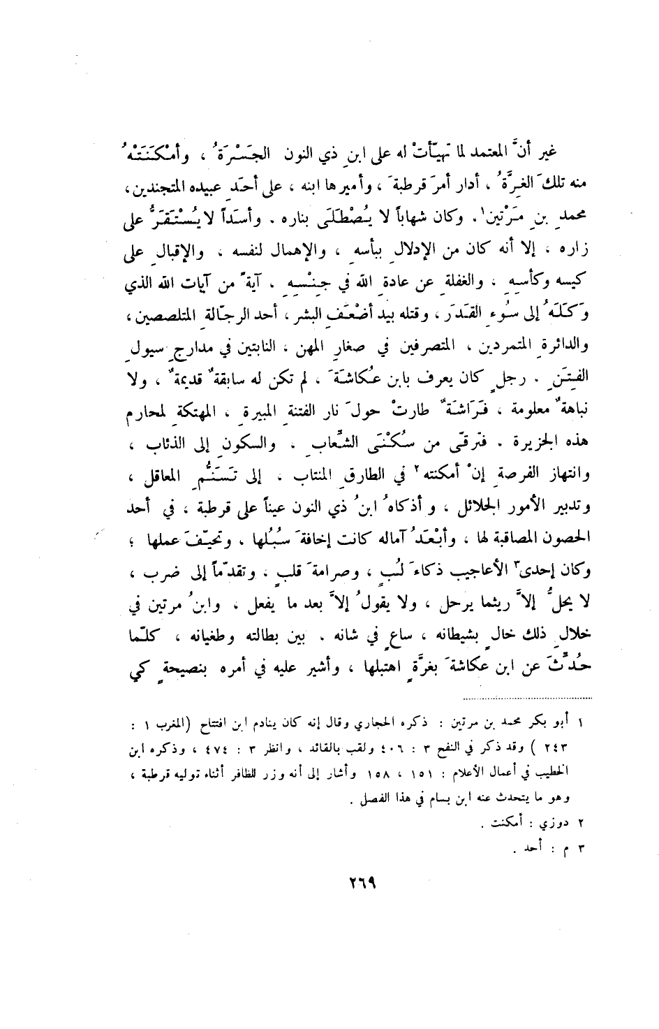 غير أن المعتمد لما تهيأت له على ابن ذي النون الجسرة، وأمكنته منه تلك الغرة، أدار أمر قرطبة، وأميرها ابنه، على أحد عبيده المتجندين، محمد بن مرتين، وكان شهاباً لا يصطلي بناره، وأسداً لا يستقر على زاره، إلا أنه كان من الإدلال ببأسه، والإهمال لنفسه، والإقبال على كيسه وكأسه، والغفلة عن عادة الله في جنسه، آيةً من آيات الله الذي وكله إلى سوء القدر، وقتله بيد أضعف البشر، أحد الرجالة المتلصصين، والدائرة المتمردين، المتصرفين في صغار المهن، النابتين في مدارج سيول الفتن، رجلٍ كان يعرف بابن عكاشة، لم تكن له سابقة قديمة، ولا نباهة معلومة، فراشة طارت حول نار الفتنة المبيرة، المهتكة لمحارم هذه الجزيرة، فترقى من سكنى الشعاب، والسكون إلى الذئاب، وانتهاز الفرصة إن أمكنته في الطارق المنتاب، إلى تسنم المعاقل، وتدبير الأمور الجلائل، وأذكاه ابن ذي النون عيناً على قرطبة، في أحد الحصون المصاقبة لها، وأبعد آماله كانت إخافة سبلها، وتحيف عملها؛ وكان إحدى الأعاجيب ذكاء لبٍ، وصرامة قلب، وتقدماً إلى ضرب، لا يحل إلا ريثما يرحل، ولا يقول إلا بعد ما يفعل، وابن مرتين في خلال ذلك خال بشيطانه، ساع في شانه، بين بطالته وطغيانه، كلما حدث عن ابن عكاشة بغرةٍ اهتبلها، وأشير عليه في أمره بنصيحةٍ كي