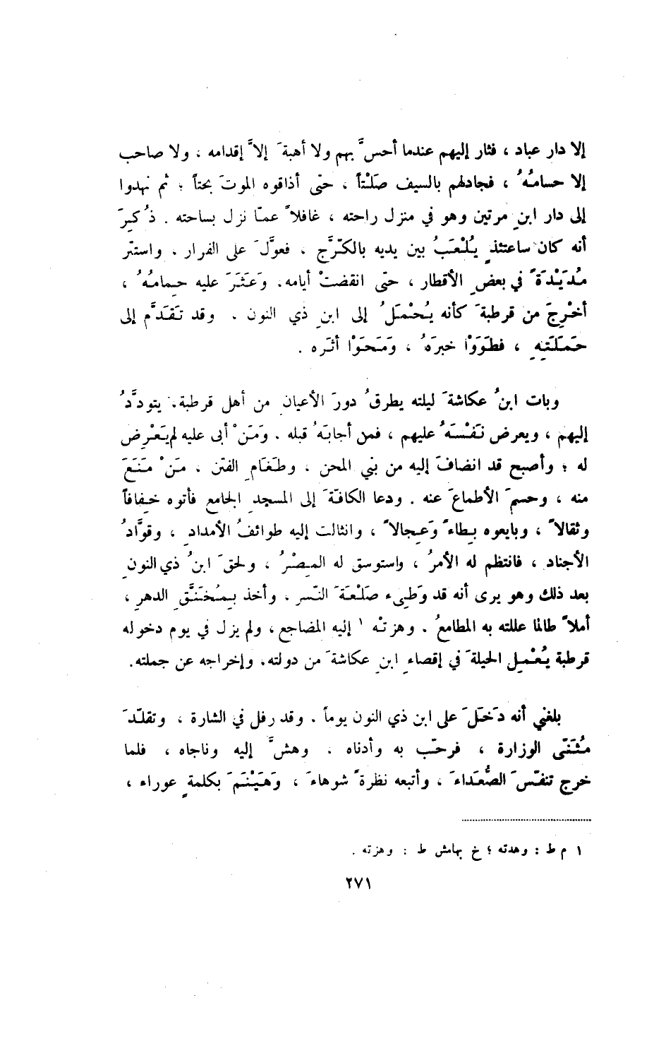 إلا دار عباد، فثار إليهم عندما أحس بهم ولا أهبة إلا إقدامه، ولا صاحب إلا حسامه، فجادلهم بالسيف صلتاً، حتى أذاقوه الموت بحتاً؛ ثم نهدوا إلى دار ابن مرتين وهو في منزل راحته، غافلاً عما نزل بساحته. ذكر أنه كان ساعتئذٍ يلعب بين يديه بالكرج، فعول على الفرار، واستتر مديدةً في بعض الأقطار، حتى انفضت أيامه، وعثر عليه حمامه، أخرج من قرطبة كأنه يحمل إلى ابن ذي النون، وقد تقدم إلى حملته، فطووا خبره، ومحوا أثره.