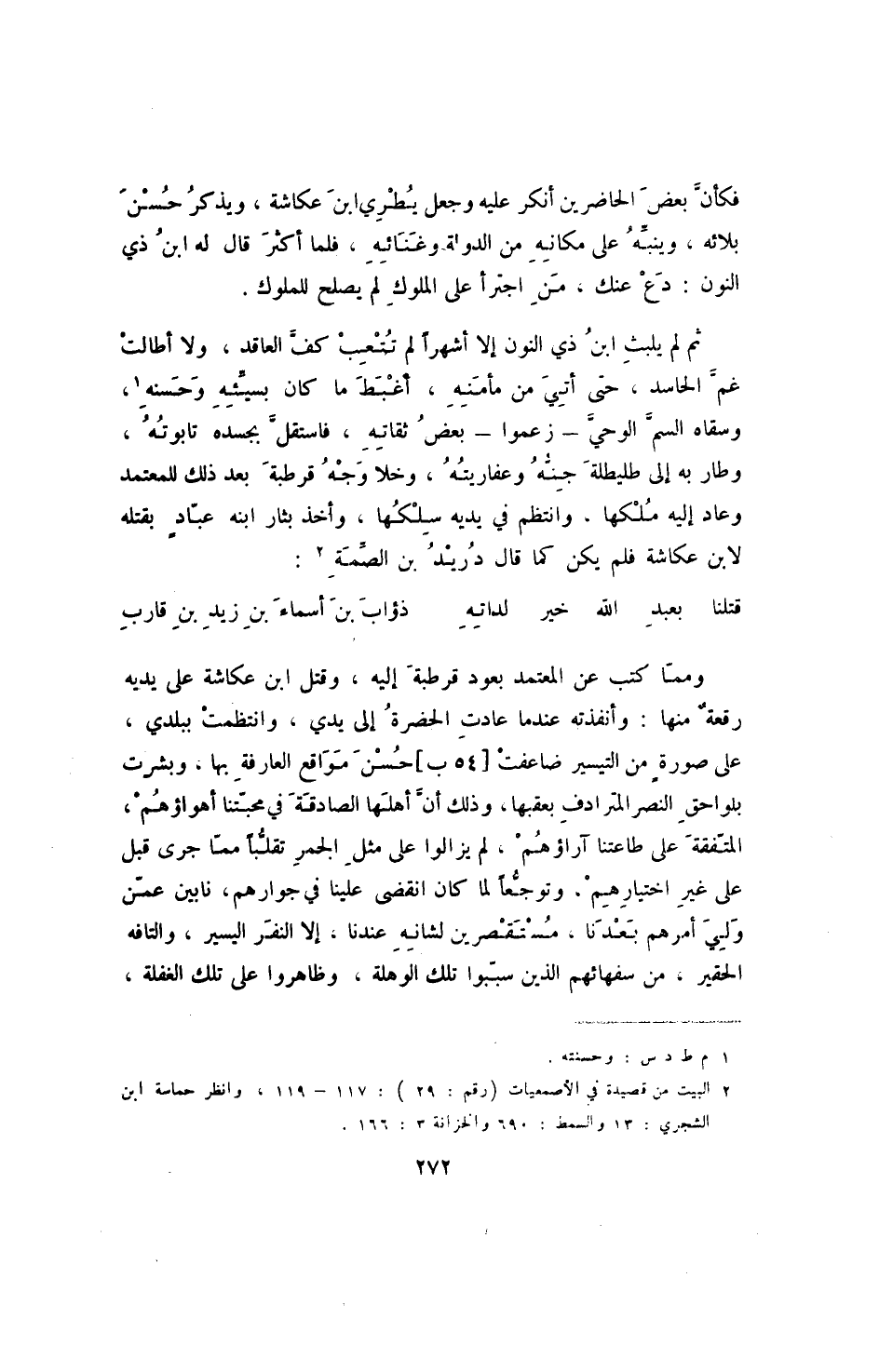 قتلنا بعبد الله خير لداته ... ذؤاب بن أسماء بن زيد بن قارب ومما كتب عن المعتمد بعود قرطبة إليه، وقتل ابن عكاشة على يديه رقعة منها: وأنفذته عندما عادت الحضرة إلى يدي، وانتظمت ببلدي، على صورةٍ من التيسير ضاعفت [54ب] حسن مواقع العارفة بها، وبشرت بلواحق النصر المترادف بعقبها، وذلك أن أهلها الصادقة في محبتنا أهواؤهم، المتفقة على طاعتنا آراؤهم، لم يزالوا على مثل الجمر تقلباً مما جرى قبل على غير اختيارهم، وتوجعاً لما كان انقضى علينا في جوارهم، نابين عمن ولي أمرهم بعدنا، مستقصرين لشانه عندنا، إلا النفر اليسير، والتافه الحقير، من سفهائهم الذين سببوا تلك الوهلة، وظاهروا على تلك الغفلة