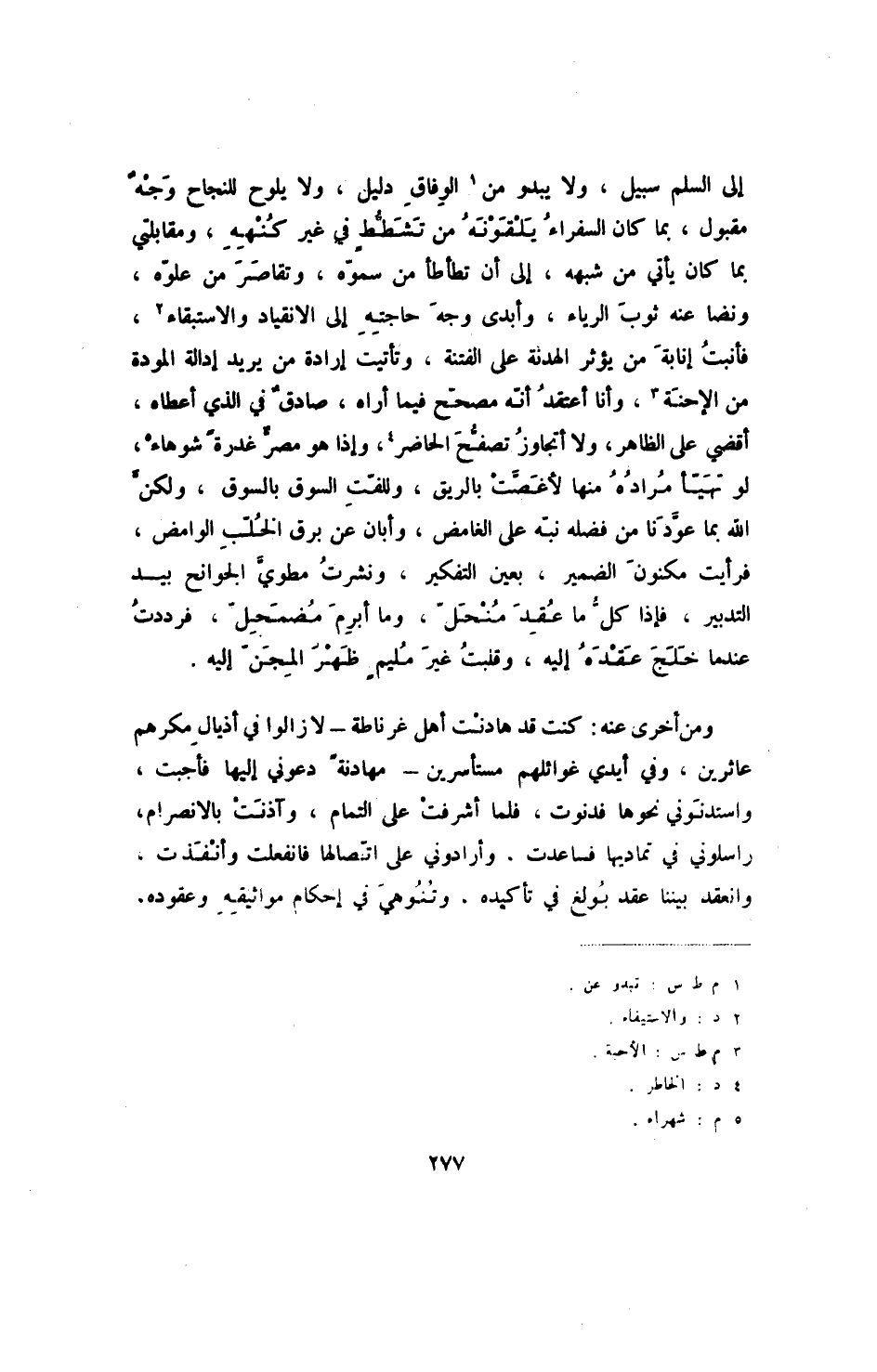 إلى السلم سبيل، ولا يبدو من الوفاق دليل، ولا يلوح للنجاح وجه مقبول، بما كان السفراء يلقونه من تشطط في غير كنهه، ومقابلتي بما كان يأتي من شبهه، إلى أن تطأطأ من سموه، وتقاصر من علوه، ونضا عنه ثوب الرياء، وأبدى وجه حاجته إلى الانقياد والاستبقاء، فأنبت إنابة من يؤثر الهدنة على الفتنة، وتأتيت إرادة من يريد إدالة المودة من الإحنة، وأنا أعتقد أنه مصحح فيما أراه، صادق في الذي أعطاه، أقضي على الظاهر، ولا أتجاوز تصفح الحاضر، وإذا ما هو مصر غدرةً شوهاء، لو تهيأ مراده منها لأغصت بالريق، وللفت السوق بالسوق، ولكن الله بما عودنا من فضلة نبه على الغامض، وأبان عن برق الخلب الوامض، فرأيت مكنون الضمير، بعين التفكير، ونشرت مطوي الجوانح بيد التدبير، فإذا كل ما عقد منحل، وما أبرم مضمحل، فرددت عندما خلج عقده إليه، وقلبت غير مليم ظهر المجن إليه.