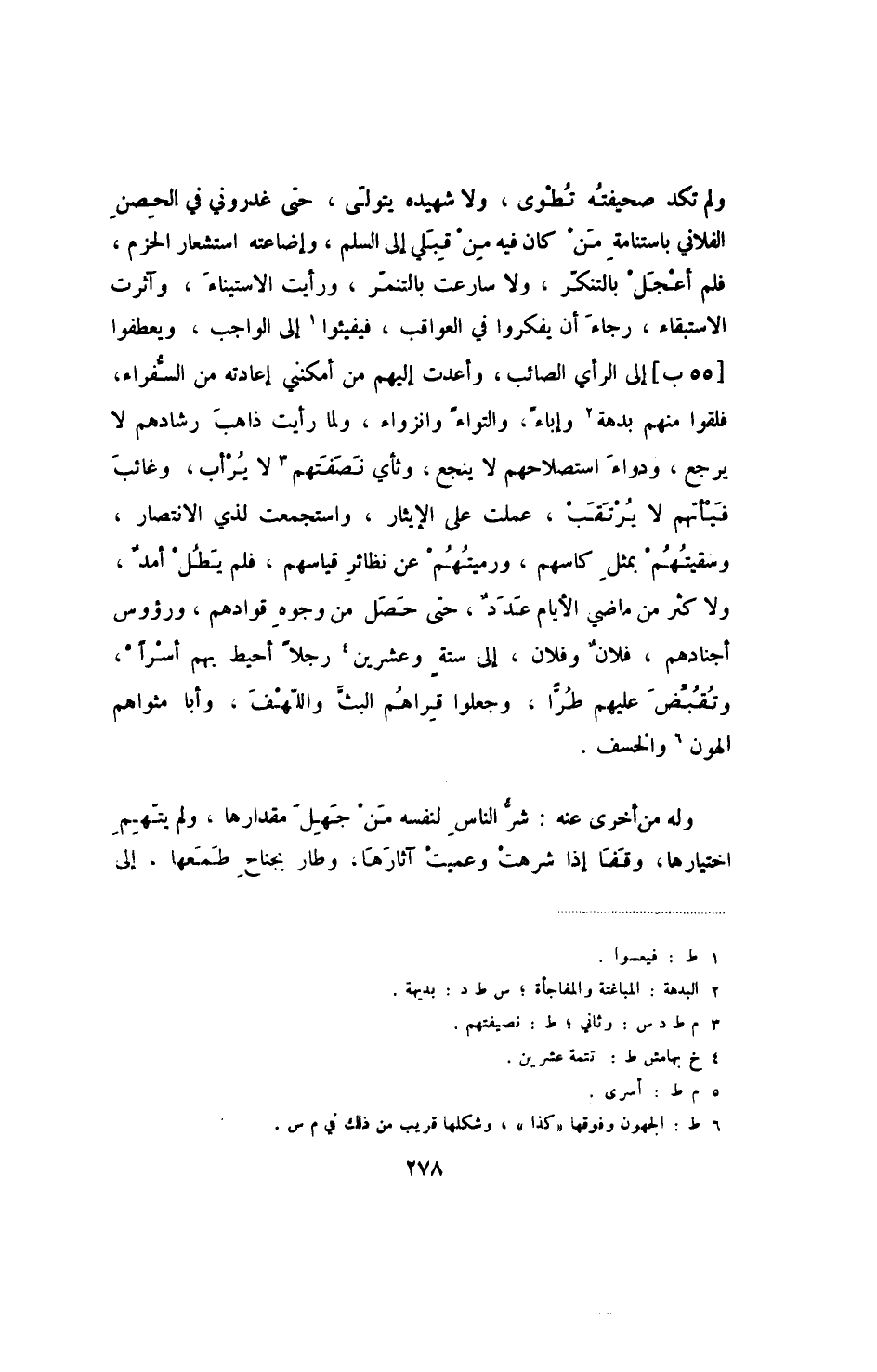 ولم تكد صحيفته تطوى، ولا شهيده يتولى، حتى غدروني في الحصن الفلاني باستنامة من كان فيه من قبل إلى السلم، وإضاعته استشعار الحزم، فلم أعجل بالتنكر، ولا سارعت بالتنمر، ورأيت الاستيناء، وآثرت الاستبقاء، رجاء أن يفكروا في العواقب، فيفيئوا إلى الواجب، ويعطفوا [55ب] إلى الرأي الصائب، وأعدت إليهم من أمكنني إعادته من السفراء، فلقوا منهم بدهة وإباءً، والتواءً وانزواء، ولما رأيت ذاهب رشادهم لا يرجع، ودواء استصلاحهم لا ينجع، وثأي نصفتهم لا يرأب، وغائب فيأتهم لا يرتقب، عملت على الإيثار، واستجمعت لذي الانتصار، وسقيتهم بمثل كاسهم، ورميتهم عن نظائر قياسهم، فلم يطل أمد، ولا كثر من ماضي الأيام عدد، حتى حصل من وجوه قوادهم، ورؤوس أجنادهم، فلان وفلان، إلى ستةٍ وعشرين رجلاً أحيط بهم أسراً، وتقبض عليهم طراً، وجعلوا قراهم البث واللهف، وأبا مثواهم الهون والخسف.