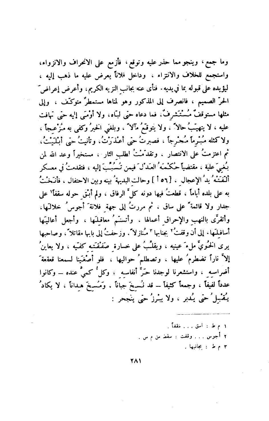وما جمع، وينجو مما حذر عليه وتوقع، فأزمع على الانحراف والانزواء، واستجمع للخلاف والانتزاء، وداخل فلاناً يعرض عليه مما ذهب إليه، ليؤيده على قبوله بما في يديه، فنأى عنه بجانب النزيه الكريم، وأعرض إعراض الحر الصميم، فانصرف إلى المذكور وهو لمناها مستمطر متوكف، وإلى مثلها مستوقف مستشرف، فما دعاه حتى لباه، ولا أومي إليه حتى تهافت عليه، لا يتهيب حالاً، ولا يتوقع مآلاً، وبلغني الخبر وكفى به مزعجاً، ولا كمثله مبرماً محرجاً، فصبرت حتى أعذرت، وتأنيت حتى أبليت، ثم اعتزمت على الانتصار، وتقدمت لطلب، الثار، مستخيراً وعد الله لمن بغي عليه، مقتضياً حكمه العدل فيمن تسبب إليه، فتقدمت في معسكر ألفته يد الإعجال، [56أ] وحالت البديهة بينه وبين الاحتفال، فأنخت به على بلده أياماً، قطعت فيها دونه كل الرفاق، ولم أبق حوله سقفاً على جدار ولا قائمةً على ساق، ثم مررت إلى جهة فلانة أجوس خلالها، وأتقرى بالنهب والإحراق أعمالها، وأتسنم معاقلها، وأجعل أعاليها أسافلها، إلى أن وقفت بجانبها منازلاً، وزحفت إلى بابها مقاتلاً، وصاحبها يرى الخوي ملء عينيه، ويقلب على خسارة صفقته كفيه، ولا يعاين إلا ناراً تضطرم عليها، وتصطلم حواليها، فلو أصغينا لسمعنا قعقعة أضراسه، واستشعرنا لوجدنا حر أنفاسه؛ وكل كمي عنده - وكانوا عدداً لفيفاً، وجمعاً كثيفاً - فد نسخ جباناً، ومسخ هداناً، لا يكاد يقبل حتى يدبر، ولا يبرز حتى ينجحر: