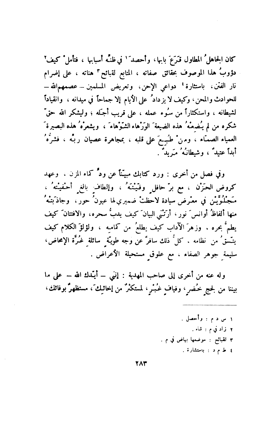 وفي فصل من أخرى: ورد كتابك مبيناً عن ود كماء المزن، وعهد كروض الحزن، مع بر حافلٍ وفيته، إلطاف بالغٍ أحفيته، مجلوين في معرض سيادة لاحظت ضميري لها عيون حور، وجاذبته منها ألفاظ أو انس نور، أرتني البيان كيف يدب سحره، والافتنان كيف يطم بحره، وزهر الآداب كيف يطلع من كمامه، ولؤلؤ الكلام كيف يتسق من نظامه، كل ذلك سافر عن وجهه طويةٍ سائلة غرة الإمحاض، سليمة جوهر الصفاء، مع علوقٍ مستحيلة الأعراض.