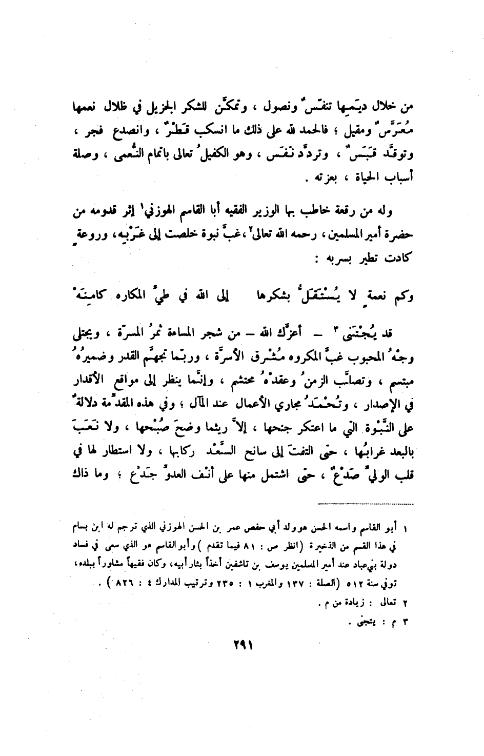 وكم نعمةٍ لا يستقل بشكرها ... إلى الله في طي المكاره كامنه قد يجتنى - أغرك الله - من شجر المساءة ثمر المسرة، ويجتلى وجه المحبوب غب المكروه مشرق الأسرة، وربما تجهم القدر وضميره مبتسم، وتصلب الزمن وعقده محتشم، وإنما ينظر إلى موقع الأقدار في الإصدار، وتحمد مجاري الأعمال عند المآل؛ وفي هذه المقدمة دلالة على النبوة التي ما اعتكر جنحها، إلا ريثما وضح صبحها، ولا نعب بالبعد غرابها، حتى التفت إلى سانح السعد ركابها، ولا استطار لها في قلب الولي صدع، حتى اشتمل منها على أنف العدو جدع؛ وما ذاك