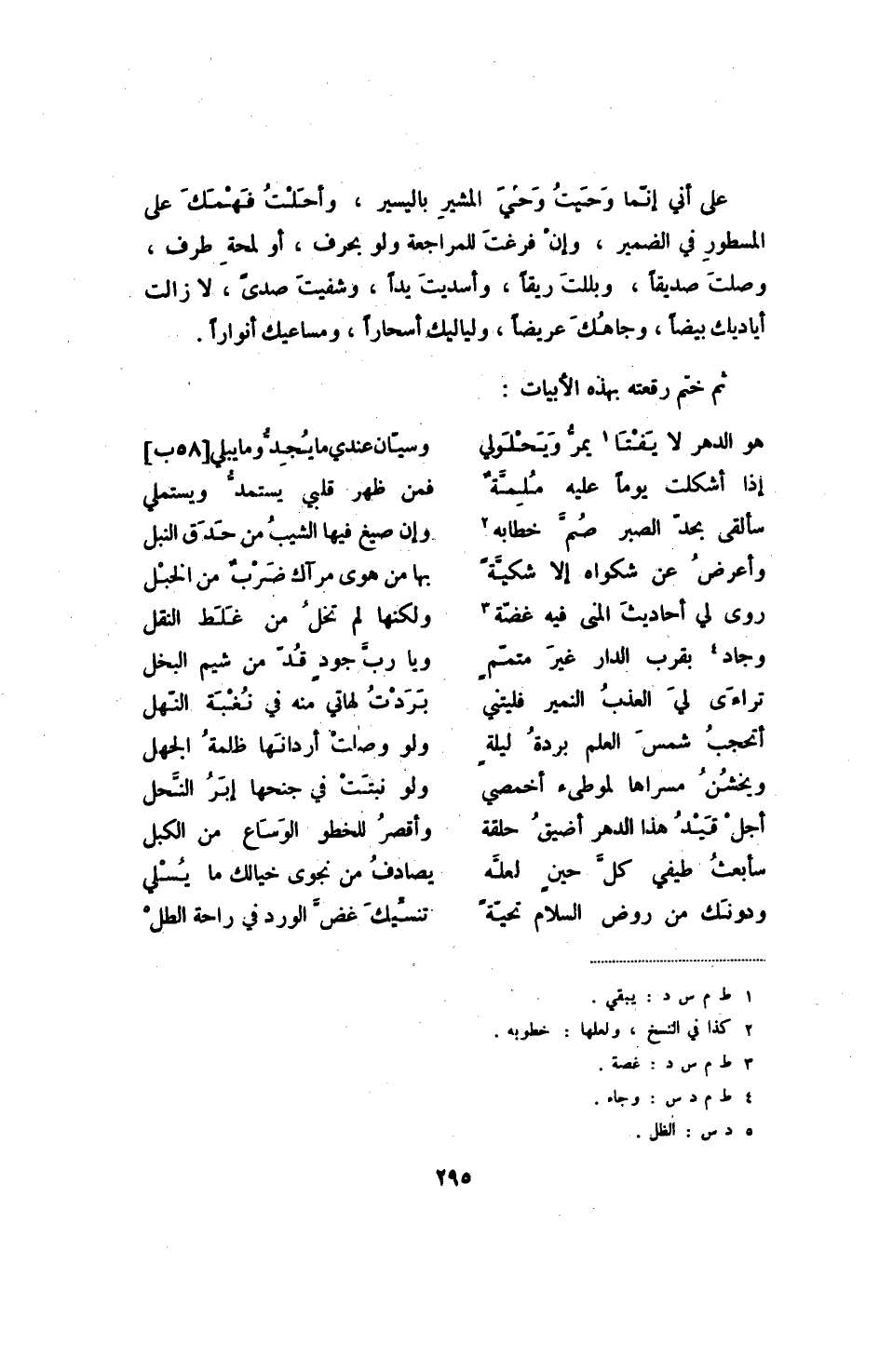 على أني إنما وحيت وحي المشير باليسير، وأحلت فهمك على المسطور في الضمير، وإن فرغت للمراجعة ولو بحرف، أو لمحة طرف، وصلت صديقاً، وبللت ريقاً، وأسديت يداً، وشفيت صدىً، لا زالت أياديك بيضاً، وجاهك عريضاً، ولياليك أسحاراً، ومساعيك أنواراً.