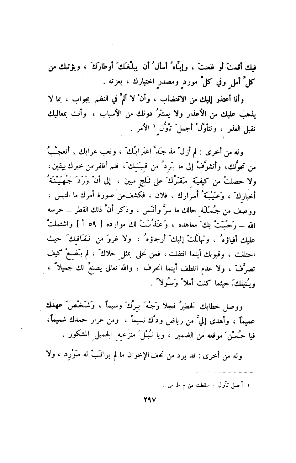 ووصل خطابك الخطير فجلا وجه برك وسيماً، وشخص عهدك عميماً، وأهدى إليّ من رياض ودك نسيماً، ومن عرار حمدك شميماً، فيا حسن موقعه من الضمير، ويا نبل منزعه الجميل المشكور.