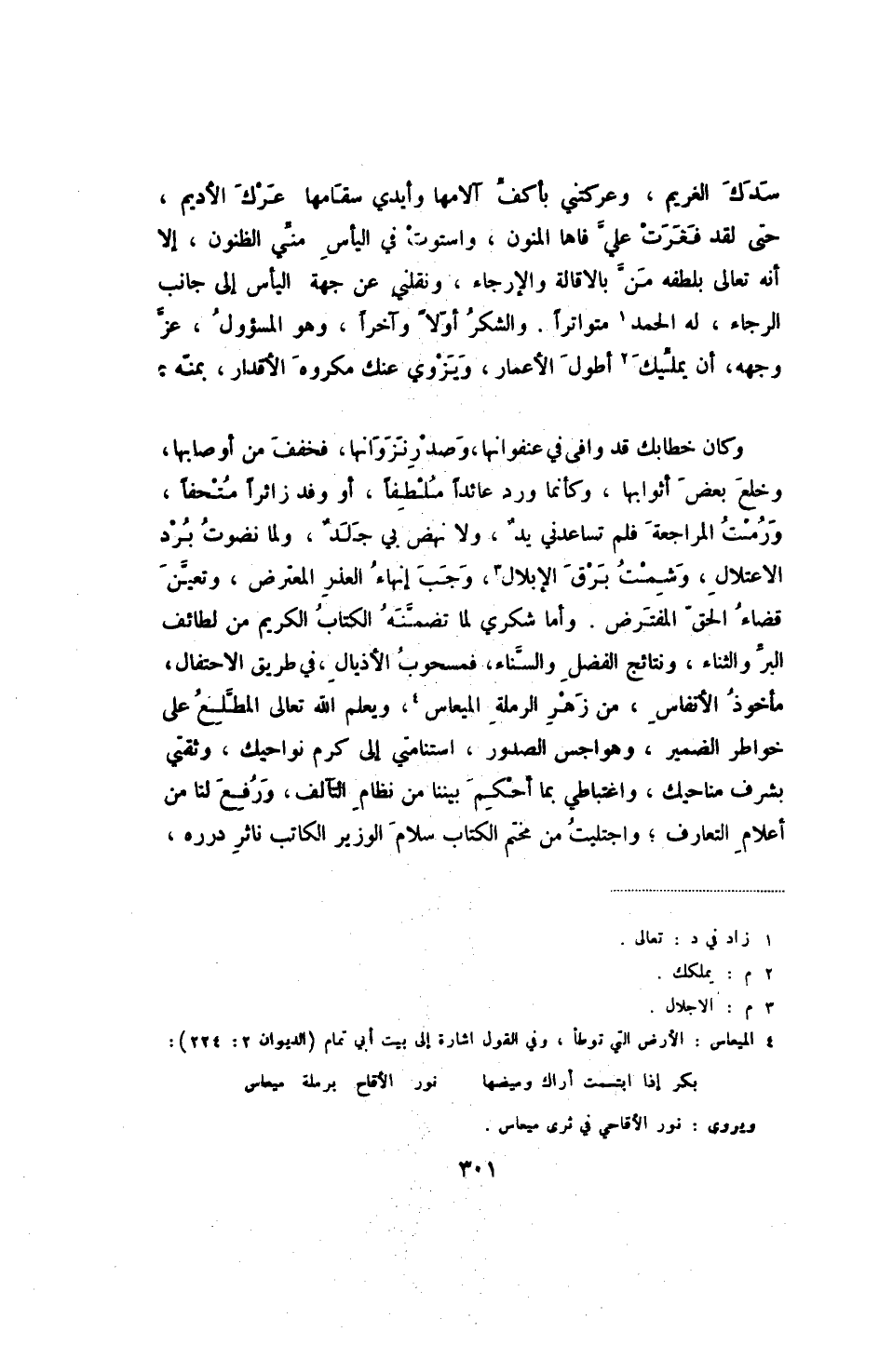 وكان خطابك قد وافى في عنفوانها، وصد رنزوانها، فخفف من أوصابها، وخلع بعض أثوابها، وكأنما ورد عائدا ملطفا، أو وفد زائرا متحفا، ورمت المراجعة فلم تساعدني يد، ولا نهض بي جلد، ولما نضوت برد الاعتلال، وشمت برق الإبلال، وجب إنهاء العذر المعترض، وتعين قضاء الحق المفترض. وأما شكري لما تضمنه الكتاب الكريم من لطائف البر والثناء، ونتائج الفضل والسناء، فمسحوب الأذيال، في طريق الاحتفال، مأخوذ الأنفاس، من زهر الرملة الميعاس، ويعلم الله تعالى المطلع على خواطر الضمير، وهواجس الصدور، استنامتي إلى كرم نواحيك، وثقتي بشرف مناحيك، واغتباطي بما أحكم بيننا من نظام التآلف، ورفع لنا من أعلام التعارف؛ واجتليت من مختم الكتاب سلام الوزير الكاتب ناثر درره