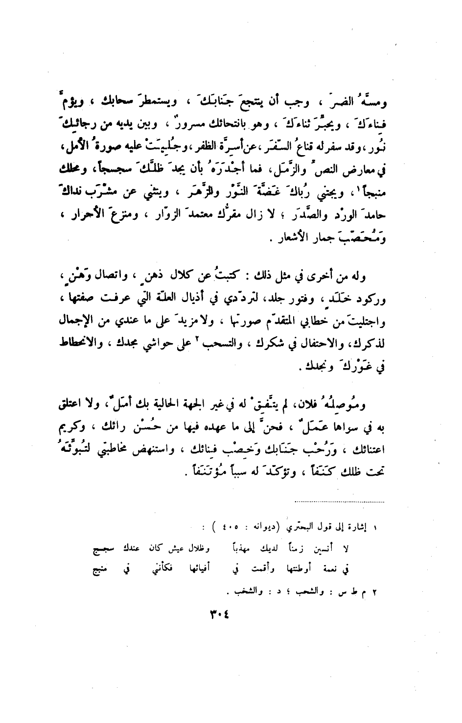 ومسه الضر، وجب أن ينتجع جنابك، ويستمطر سحابك، ويؤم فناءك، ويجبر ثناءك، وهو بانتحائك مسرور، وبين يديه من رجائك نور، وقد سفر له قناع السفر، عن أسرة الظفر، وجليت عليه صورة الأمل، في معارض النص والزمل، فما أجدره بأن يجد ظلك سجسجا، ومحلك منبجا، ويجتني رباك غضة النور والزهر، وينثني عن مشرب نداك حامد الورد والصدر؛ لا زال مقرك معتمد الزوار، ومنزع الأحرار، ومحصب جمار الأشعار.