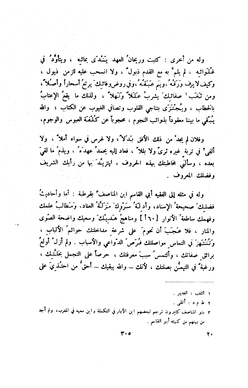 وله في مثله إلى الفقيه أبي القاسم ابن المناصف بقرطبة: أما وأحاديث فضلك صحيحة الإسناد، وأدلة سروك مزلة العناد، ومطالب علمك وفهمك ساطعة الأنوار [60 أ] ومناهج هديك وسعيك واضحة الصوى والمنار، فلا عجب أن تحوم على شرعة مداخلتك حوائم الألباب، وتنتهز في التماس مواصلتك فرص الدواعي والأسباب. ولم أزل أولع برائق صفاتك، وألتمس سبب معرفتك، حرصا على التجمل بختلك، ورغبة في التيمن بصلتك، لأنك - والله يبقيك - أحق من احتذي على