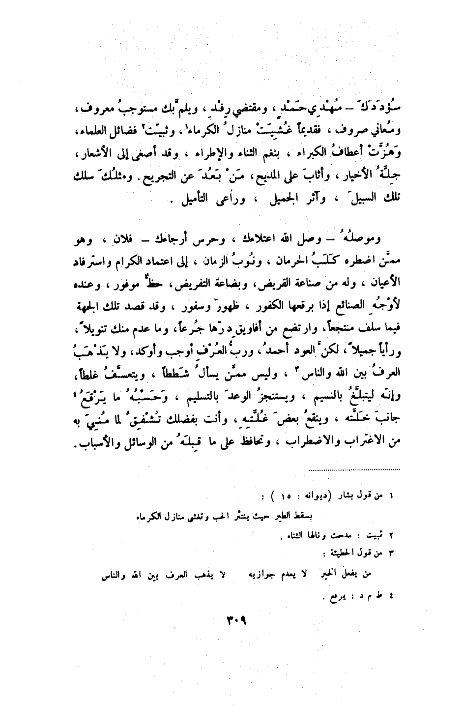 سؤددك - مهدي حمدٍ، ومقتضي رفد، ويلم بك مستوجب معروف، ومعاني صروف، فقديماً غشيت منازل الكرماء، وثبيت فضائل العلماء، وهزت أعطاف الكبراء، بنغم الثناء والإطراء، وقد أصغى إلى الأشعار، جلة الأخيار، وأثاب على المديح، من بعد عن التجريح، ومثلك سلك تلك السبيل، وآثر الجميل، وراعى التأميل.