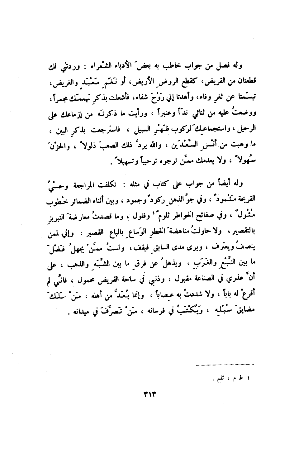 وله أيضاً من جواب على كتاب في مثله: تكلفت المراجعة وحسي القريحة مثمود، وفي جو الذهن ركود وجمود، وبين أثناء الضمائر خطوب مثول، وفي صفائح الخواطر ثلوم وفلول، وما قصدت معارضة التبريز بالتقصير، ولا حاولت مناهضة الخطو الوساع بالباع القصير، وإني لممن ينصف ويعترف، ويرى مدى السابق فيقف، ولست ممن يجهل فضل ما بين النبع والغرب، ويذهل عن فرق ما بين الشبه والذهب، على أن عذري في الصناعة مقبول، ونبي في ساحة القريض محمول، فإني لم أقرع له باباً، ولا شددت به عصاباً، وإنما يعد من أهله، من سلك مضايق سبله، ويكتب في فرسانه، من تصرف في ميدانه.