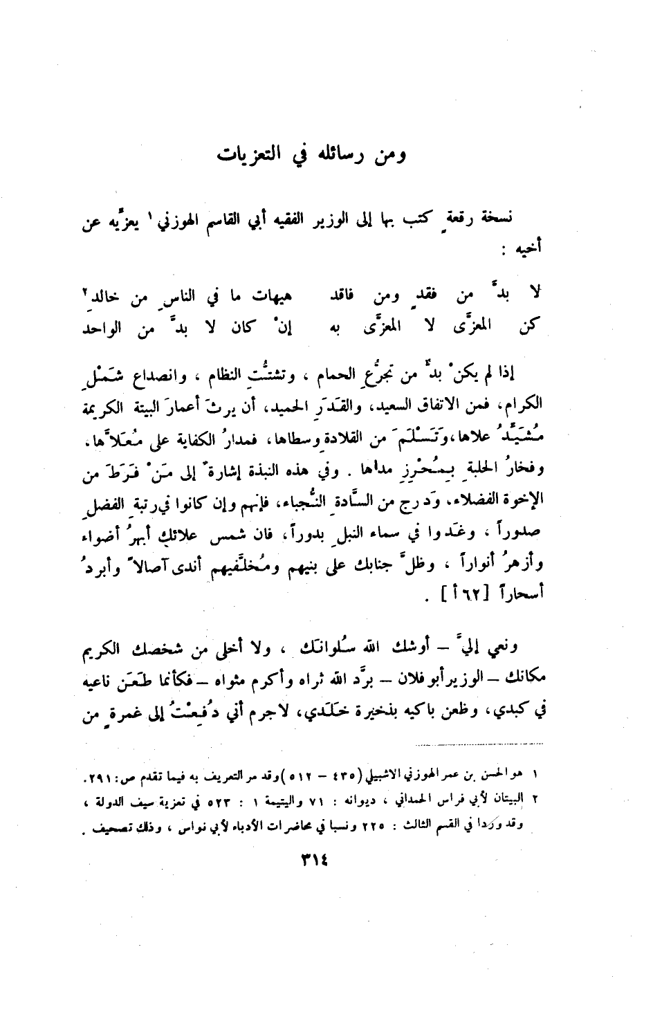 نسخة رقعةٍ كتب بها إلى الوزير الفقيه أبي القاسم الهوزني يعزيه عن أخيه: