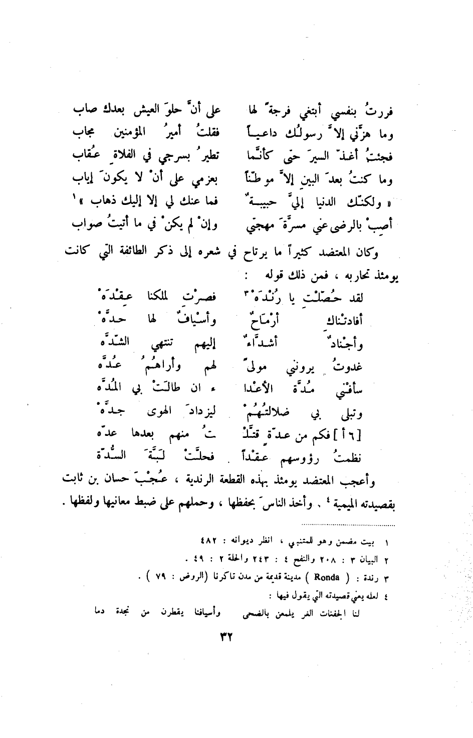 نظمت رؤوسهم عقداً ... فحلت لبة السدة وأعجب المعتضد يومئذ بهذه القطعة الرندية، عجب حسان بن ثابت بقصيدته الميمية، وأخذ الناس بحفظها، وحملهم على ضبط معانيها ولفظها.