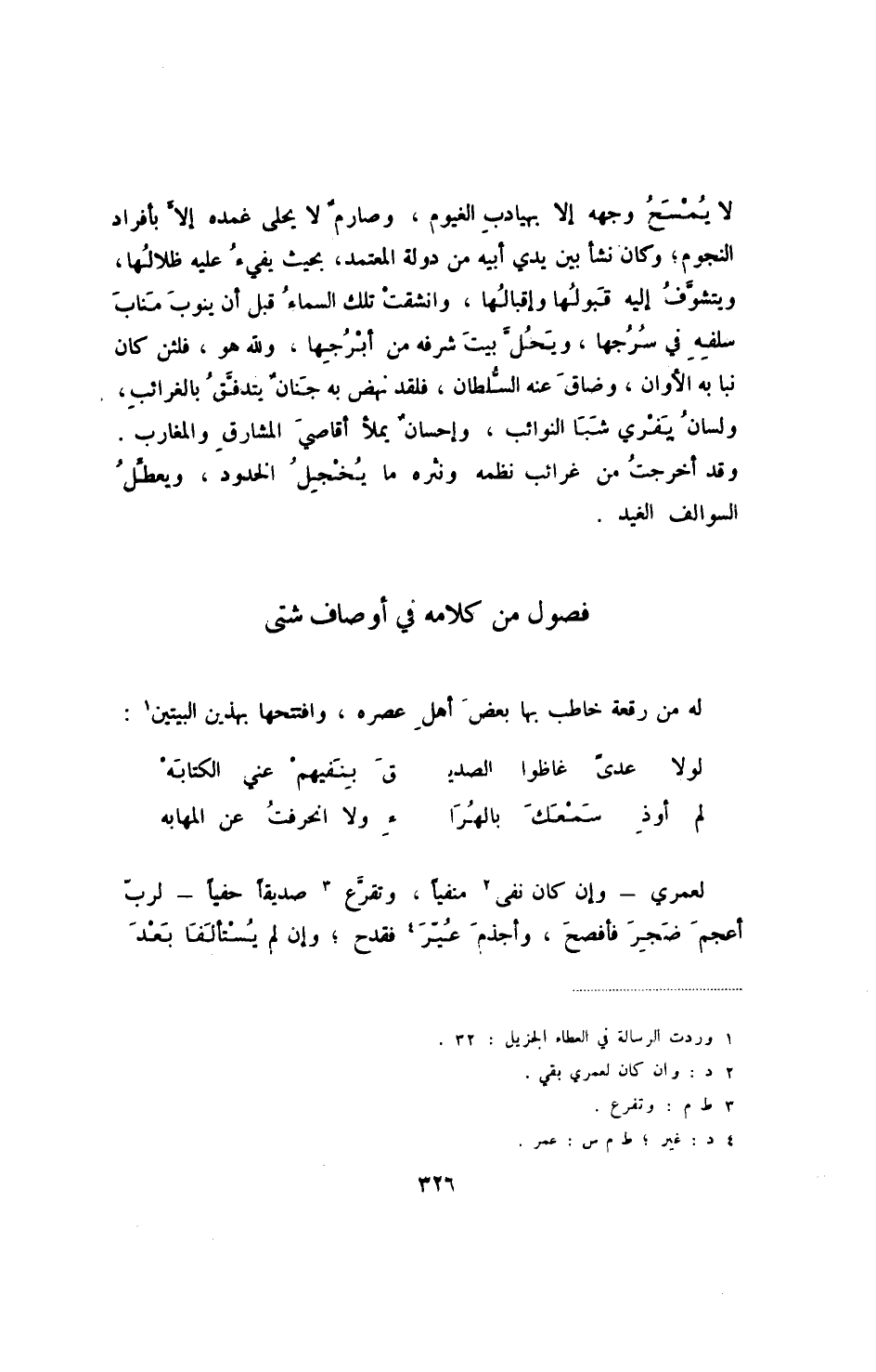 لا يسمح وجهه إلا بهيادب الغيوم، وصارم لا يحلى غمده إلا بأفراد النجوم؛ وكان نشأ بين يدي أبيه من دولة المعتمد، بحيث يفيء عليه ظلالها، ويتشوف إليه قبولها وإقبالها، وانشفت تلك السماء قبل أن ينوب مناب سلفه في سرجها، ويحل بيت شرفه من أبرجها، ولله هو، فلئن كان نبا به الأوان، وضاق عنه السلطان، فلقد نهض به جنان يتدفق بالغرائب، ولسان يفري شبا النوائب، وإحسان يملأ أقاصي المشارق والمغارب. وقد أخرجت من غرائب نظمه ونثره ما يخجل الخدود، ويعطل السوالف الغيد.