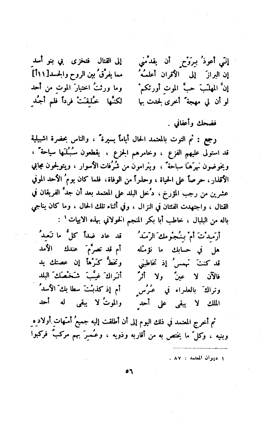 رجع: ثم التوت بالمعتمد الحال أياماً يسيرة، والناس بحضرة إشبيلية قد استولى علهم الفزع، وخامرهم الجزع، يقطعون سبلها سياحةً، ويخوضون نهرها سباحةً، ويترامون من شرفات الأسوار، ويتولجون مجابي الأقذار، حرصاً على الحياة، وحذراً من الوفاة، فلما كان يوم الأحد الموفي عشرين من رجب المؤرخ، دخل البلد على المعتمد بعد أن جد الفريقان في القتال، واجتهدت الفئتان في النزال، وفي أثناء تلك الحال، وما كان يناجي باله من البلبال، خاطب أبا بكر المنجم الخولاني بهذه الأبيات: