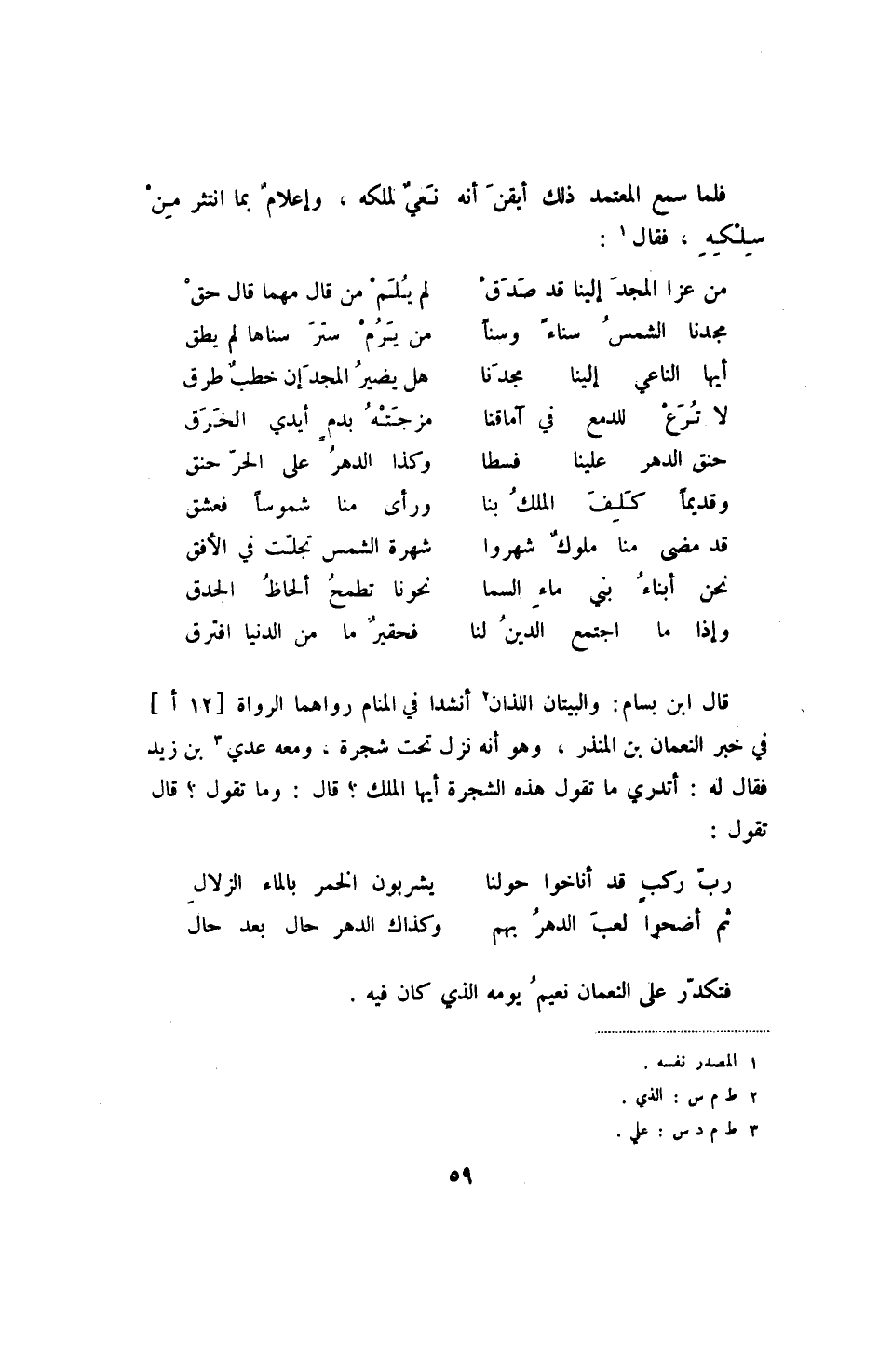 وإذا ما اجتمع الدين لنا ... فحقير ما من الدنيا افترق قال ابن بسام: والبيتان اللذان أنشدا في المنام رواهما الرواة [12أ] في خبر النعمان بن المنذر، وهو أنه نزل تحت شجرة، ومعه عدي بن زيد فقال له: أتدري ما تقول هذه الشجرة أيها الملك - قال تقول: