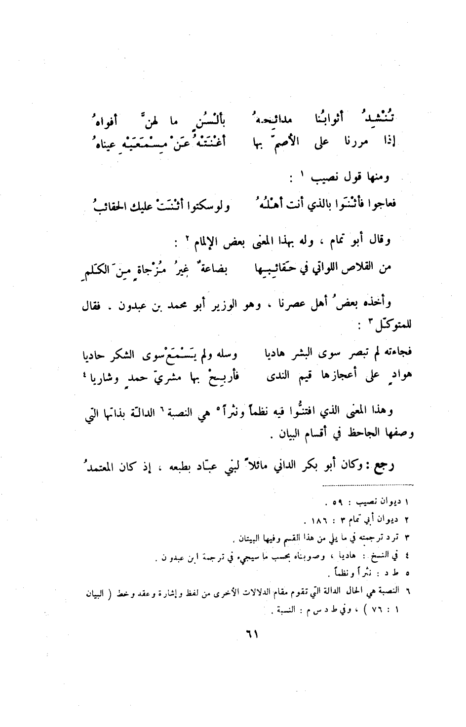 هوادٍ على أعجازها قيم الندى ... فأربح بها مشري حمد وشاريا وهذا المعنى الذي افتنوا فيه نظماً ونثراً هي النصبة الدالة بذاتها التي وصفها الجاحظ في أقسام البيان.