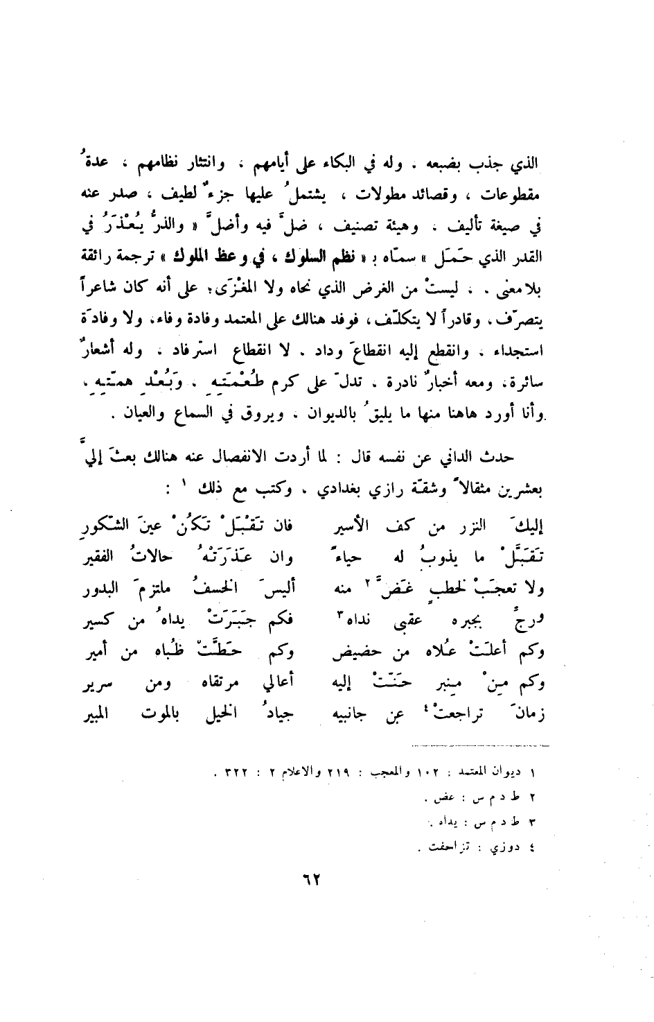 الذي جذب بضبعه، وله في البكاء على أيامهم، وانتثار نظامهم، عدة مقطوعات، وقصائد مطولات، يشتمل عليها جزء لطيف، صدر عنه في صيغة تأليف، وهيئة تصنيف، ضل فيه وأضل " والذر يعذر في القدر الذي حمل " سماه ب - " نظم السلوك، في وعظ الملوك " ترجمة رائقة بلا معنى،، ليست من الغرض الذي نحاه ولا المغزى؛ على أنه كان شاعرا يتصرف، وقادرا لا يتكلف، فوفد هنالك على المعتمد وفادة وفاء، ولا وفادة استجداء، وانقطع إليه انقطاع وداد، لا انقطاع استرفاد، وله أشعار سائرة، ومعه أخبار نادرة، تدل على كرم طعمته، وبعد همته، وأنا أورد هاهنا منها ما يليق بالديوان، ويروق في السماع والعيان.