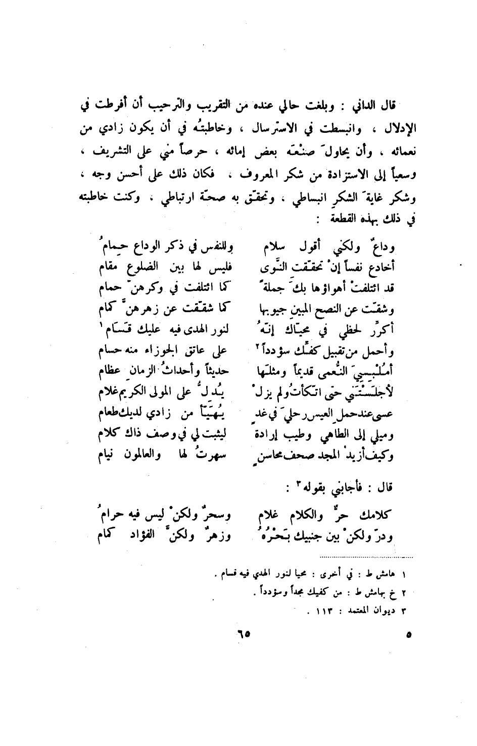 قال الداني: وبلغت حالي عنده من التقريب والترحيب أن أفرطت في الإدلال، وانبسطت في الاسترسال، وخاطبته في أن يكون زادي من نعمائه، وأن يحاول صنعه بعض إمائه، حرصا مني على التشريف، وسعيا إلى الاستزادة من شكر المعروف، فكان ذلك على أحسن وجه، وشكر غاية الشكر ابنساطي، وتحقق به صحة ارتباطي، وكنت خاطبته في ذلك بهذه القطعة: