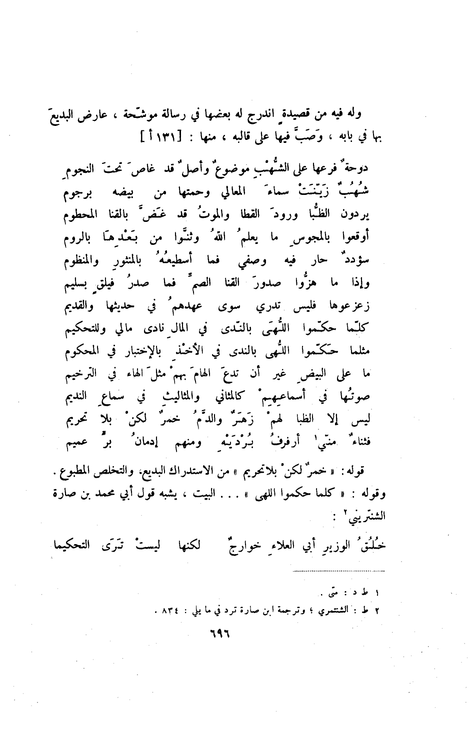 دوحة فرعها على الشهب موضوع وأصل قد غاص تحت النجوم ... شهب زينت سماء المعالي وحمتها من بيضه برجوم ... يردون الظبا ورود القطا والموت قد غض بالقنا المحطوم ... أوقعوا بالمجوس ما يعلم الله وثنوا من بعدها بالروم ... سؤدد حار فيه وصفي فما أسطيعه بالمنثور والمنظوم ... وإذا ما هزوا صدور القنا الصم فما صدر فيلقٍ بسليم ... زعزعوها فليس تدري سوى عهدهم في حديثها والقديم ... كلما حكموا اللهى بالندى في المال نادى مالي وللتحكيم ... مثلما حكموا اللهى بالندى في الأخذ بالاختبار في المحكوم ... ما على البيض غير أن تدع الهام بهم مثل الهاء في الترخيم ... صوتها في أسماعهم كالمثاني والمثاليث في سماع النديم ... ليس إلا الظبا لهم زهر والدم خمر لكن بلا تحريم ... فثناء مني (1) أرفرف برديه ومنهم إدمان بر عميم ... قوله: " خمر لكن بلا تحريم " من الاستدراك البديع، والتخلص المطبوع. وقوله: " كلما حكموا اللهى " ... البيت، يشبه قول أبي محمد بن صارة الشنتريني (2) :