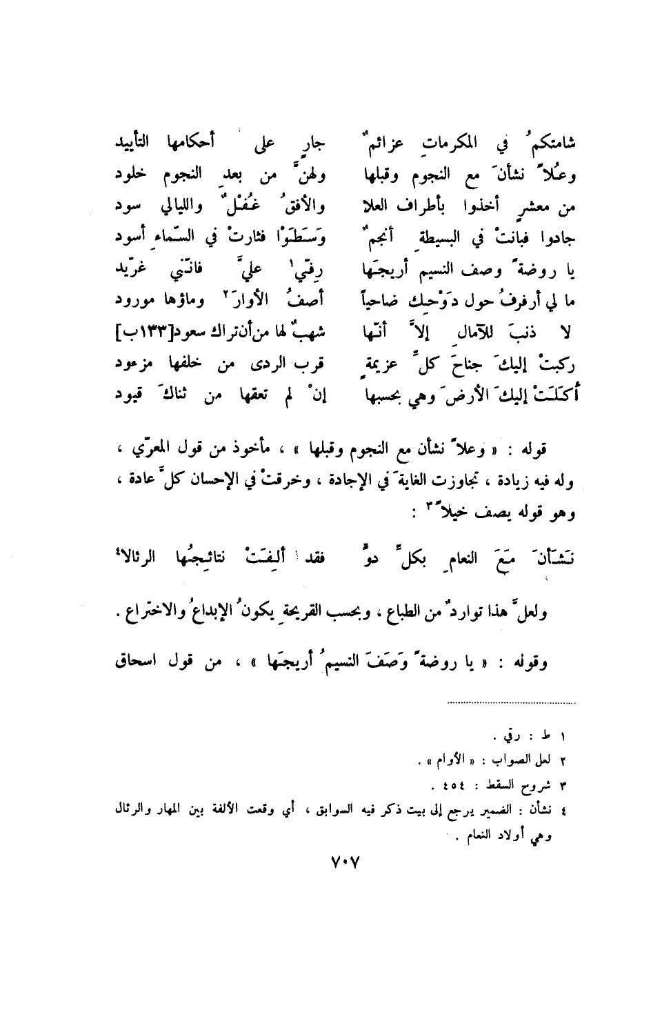 أكلت إليك الأرض وهي بحسبها ... إن لم تعقها من ثناك قيود قوله: " وعلا نشأن مع النجوم وقبلها "، مأخوذ من قول المعري، وله فيه زيادة، تجاوزت الغاية في الإجادة، وخرقت في الإحسان كل عادة، وهو قوله يصف خيلاً (3) :