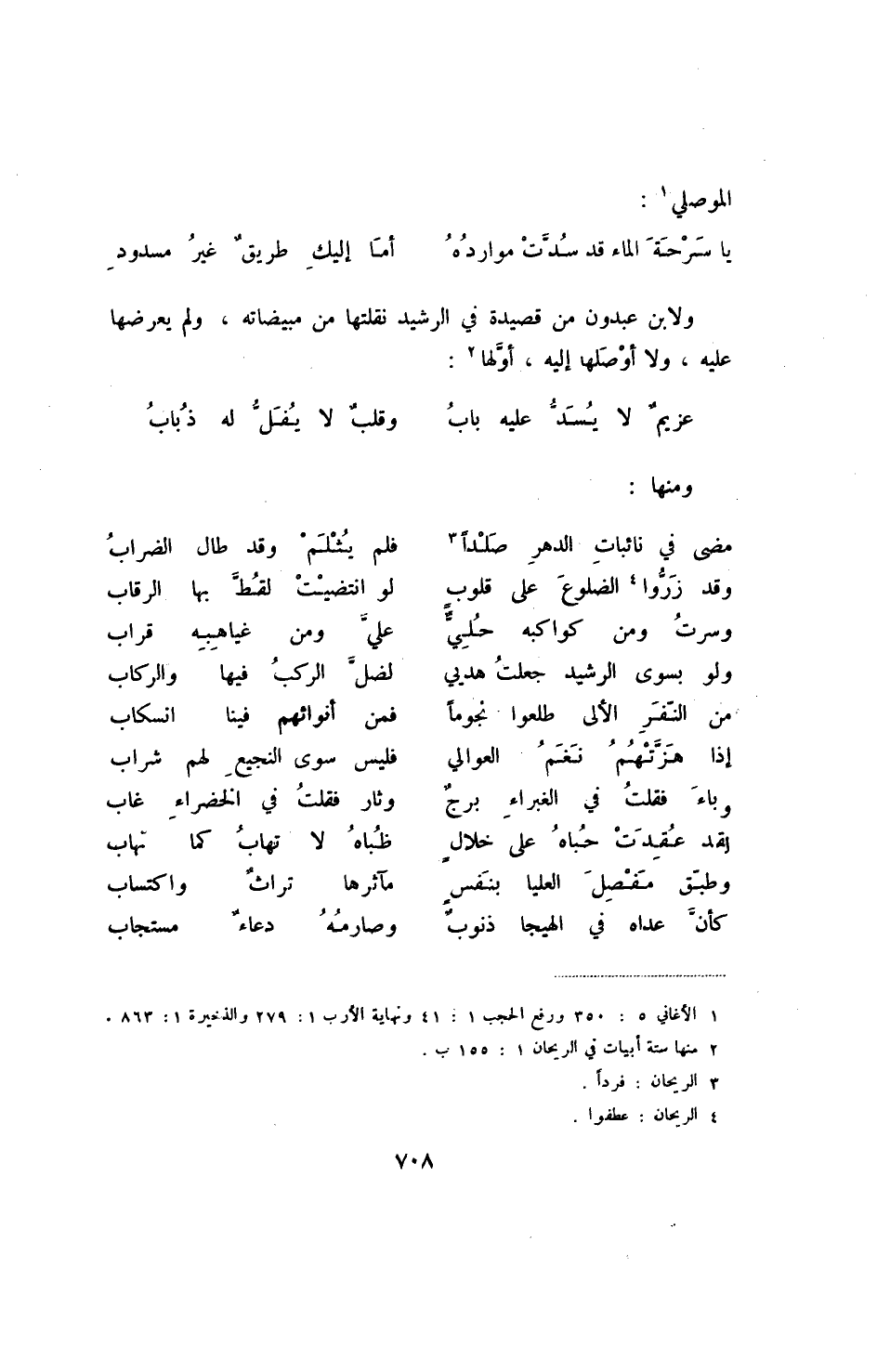 يا سرحة الماء قد سدت موارده ... أما إليك طريق غير مسدود ولابن عبدون من قصيدة في الرشيد نقلتها من مبيضاته، ولم يعرضها عليه، ولا أوصلها اليه، أولها (2) :