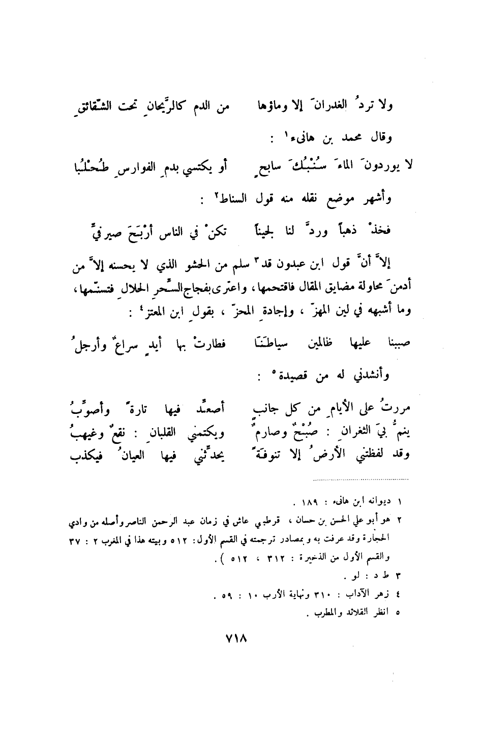 (2) هو أبو على الحسن بن حسان، قرطبي عاش في زمان عبد الرحمن الناصر وأصله من وادي الحجارة وقد عرفت به وبمصادر ترجمته في القسم الأول: 512 وبيته هذا في المغرب 2: 37 والقسم الأول من الذخيرة: 312، 512) .