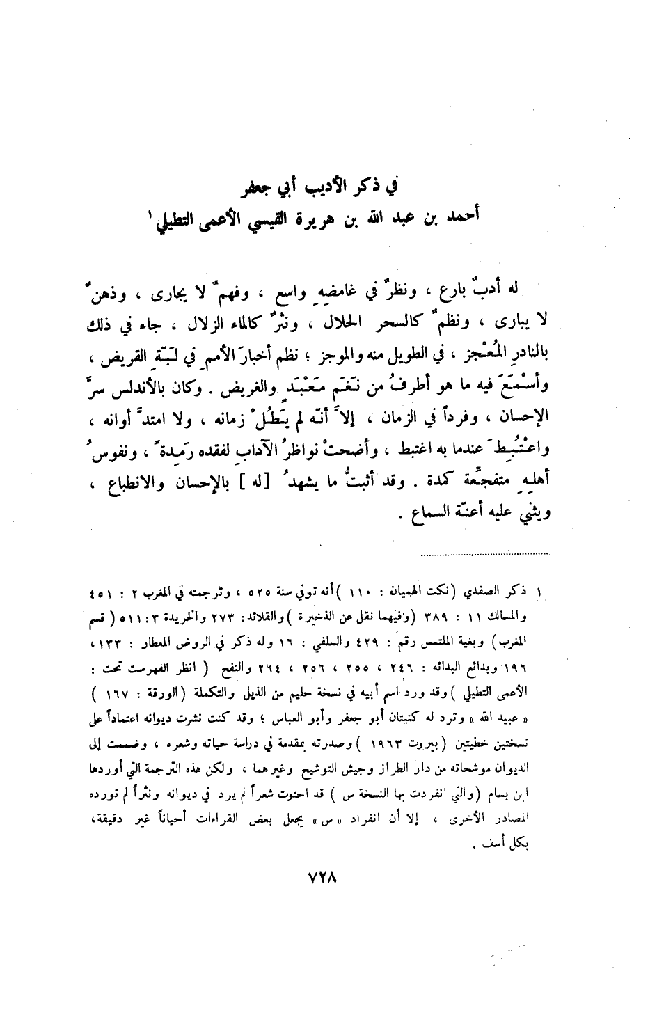 (1) ذكر الصفدي (نكت الهميان: 110) أنه توفي سنة 525، وترجمته في المغرب 2: 451 والمسالك 11: 389 (وفيهما نقل عن الذخيرة) والقلائد: 273 والخريدة 3: 511 (قسم المغرب) وبغية الملتمس رقم: 429 والسلفي: 16 وله ذكر في الروض المعطار: 133، 196 وبدائع البدائه: 246، 255، 256، 264 والنفح (انظر الفهرست تحت: الأعمى التطيلي) وقد ورد اسم أبيه في نسخة حليم من الذيل والتكملة (الورقة: 167) " عبيد الله " وترد له كنيتان أبو كعفر وأبو العباس؛ وقد كنت نشرت ديوانه اعتمادا على نسختين خطيتين (بيروت 1963) وصدرته بمقدمة في دراسة حياته وشعره، وضممت إلى الديوان موشحاته من دار الطراز وجيش التوشيح وغيرهما، ولكن هذه الترجمة التي أوردها ابن بسام (والتي انفردت بها النسخة س) قد احتوت شعرا لم يرد في ديوانه ونثرا لم تورده المصادر الأخرى، إلا أن انفراد " س " يجعل بعض القراءات أحيانا غير دقيقة، بكل أسف.