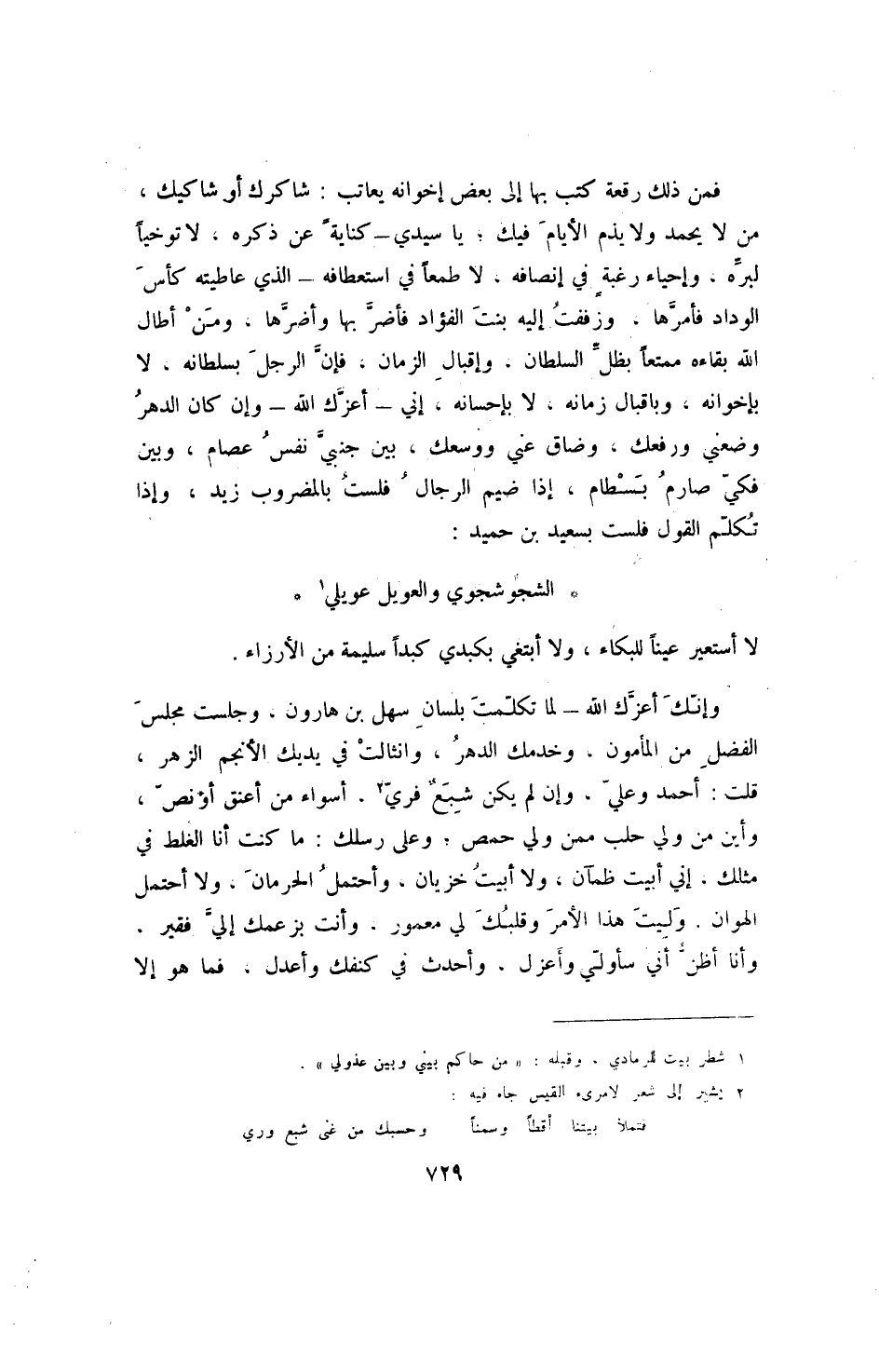 فمن ذلك رقعة كتب بها إلى بعض إخوانه يعاتب: شاكرك أو شاكيك، من لا يحمد ولا يذم الأيام فيك؛ يا سيدي - كناية عن ذكره، لا توخيا لبره، وإحياء رغبة في إنصافه، لا طمعا في استعطافه - الذي عاطيته كأس الوداد فأمرها، وزفقت إليه بنت الفؤاد فأضر بها وأضرها، ومن أطال الله بقاءه ممتعا بظل السلطان، وإقبال الزمان، فإن الرجل بسلطانه، لا بإخوانه، وبإقبال زمانه، لا بإحسانه، إني - أعزك الله - وإن كان الدهر وضعني ورفعك، وضاق عني ووسعك، بين جنبي نفس عصام، وبين فكي صارم بسطام، إذا ضيم الرجال فلست بالمضروب زيد، وإذا تكلم القول فلست بسعيد بن حميد: