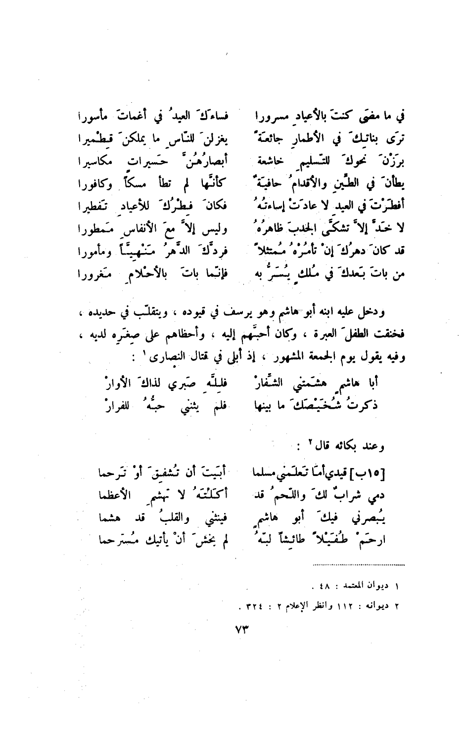 من بات بعدك في ملك يسر به ... فإنما بات بالأحلام مغرورا ودخل عليه ابنه أبو هاشم وهو يرسف في قيوده، ويتقلب في حديده، فخنقت الطفل العبرة، وكان أحبهم إليه، وأحظاهم على صغره لديه، وفيه يقول يوم الجمعة المشهور، إذ أبلى في قتال النصارى:
