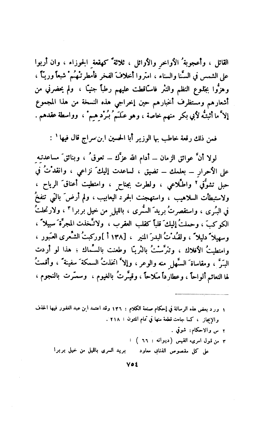 فمن ذلك رقعة خاطب بها الوزير أبا الحسين ابن سراج قال فيها (1) :