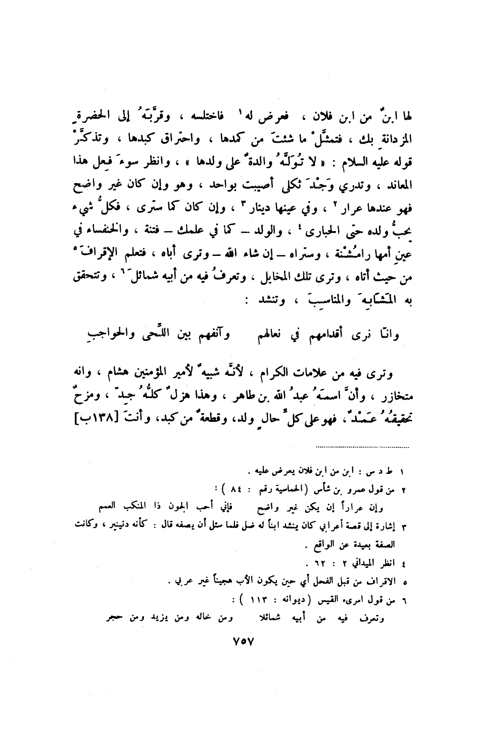 وأنا نرى أقدامهم في نعالهم ... وآنفهم بين اللحى والحواجب وترى فيه من علامات الكرام، لأنه شبيه لأمير المؤمنين هشام، وإنه متخازر، وأن اسمه عبد الله ن طاهر، وهذا هزل كله جد، ومزح تحقيقه عمد، فهو على كل حالٍ ولد، وقطعة من كبد، وأنت [138ب]