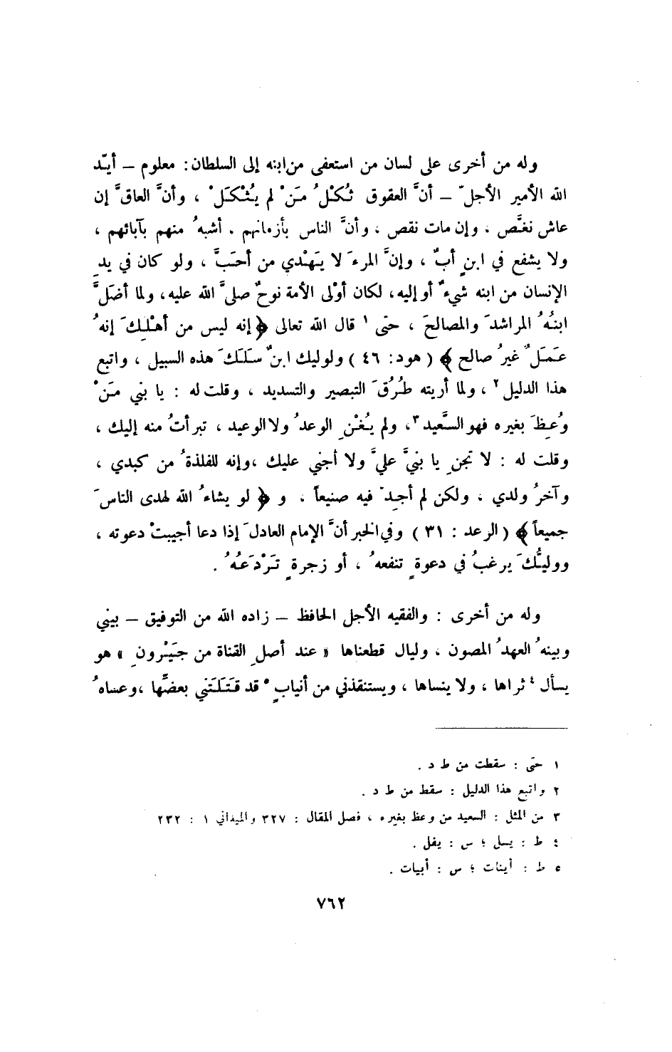 وله من أخرى على لسان من استعفى من ابنه إلى السلطان: معلوم - أيد الله الأمير الأجل - أن العقوق ثكل من لم يثكل، وأن العاق إن عاش نغص، وإن مات نقص، وأن الناس بأزمانهم، أشبه منهم بآبائهم، ولا يشفع في ابن أب، وإن المرء لا يهدي من أحب، ولو كان في يد الإنسان من ابنه شيء أو إليه، لكان أولى الأمة نوح صلى الله عليه، لما أضل ابنه المراشد والمصالح، حتى (1) قال الله تعالى {إنه ليس من أهلك إنه عمل غير صالح} (هوند: 46) ولوليك ابن سلك هذه السبيل، وابتع هذا الدليل (2) ، ولما أريته طرق التبصير والتسديد، وقلت له: يا بني من وعظ بغيره فهو السعيد (3) ، ولم يغن الوعد ولا الوعيد، تبرأت منه إليك، وقلت له: لا تجن يا بني عليّ ولا أجني عليك، وإنه للفلذة من كبدي، وآخر ولدي، ولكن لم أجد فيه صنيعاً، و {لو يشاء الله لهدى الناس جميعاً} (الرعد: 31) وفي الخبر أن الإمام العادل إذا دعا أجيبت دعوته، ووليك يرغب في دعوةٍ تنفعه، أو زجرة تردعه.