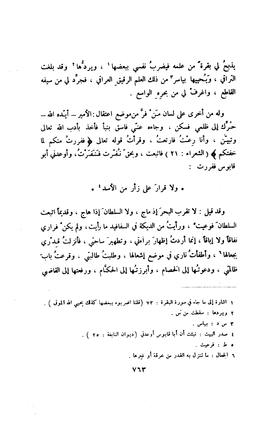 ولا قرار على زأر من الأسد (4) ... وقد قيل: لا تقرب البحر إذ ماج، ولا السلطان إذا هاج، وقديماً ابتعت السلطان فوعيت (5) ، ورأيت من الديكة في السفافيد ما رأيت، ولم يكن فراري نفاقاً ولا إباقاً، إنما أدرت إظهار براءتي، وتطهير ساحني، فأنزلت قدري بجعالها (6) ، وأطفأت ناري في موضع إشعالها، وطلبت طالبتي، وقرعت باب ظالمتي، ودعوتها إلى الخصام، وأبرزتها إلى الحكام، ورفعتها إلى القاضي