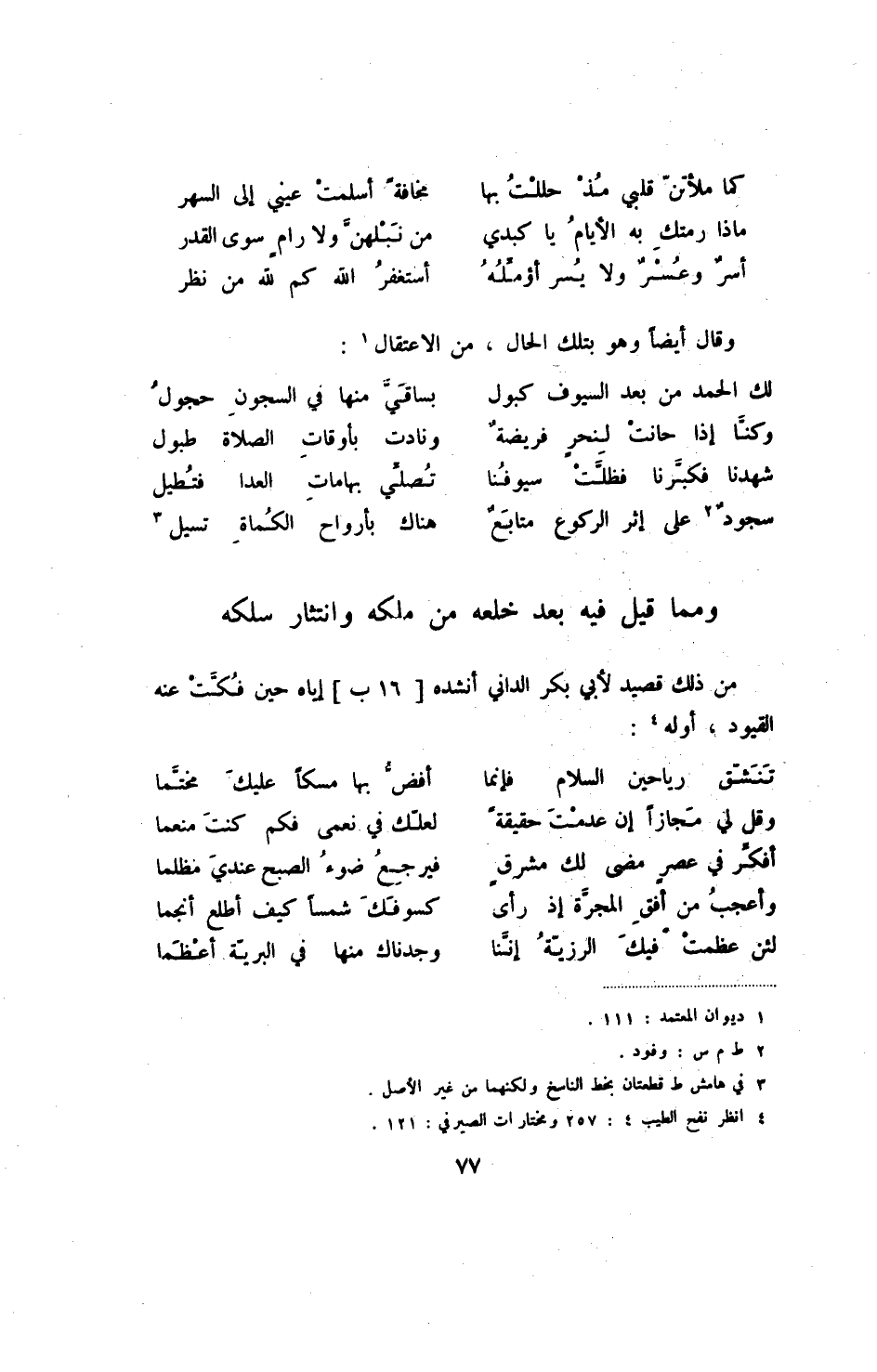 من ذلك قصيد لأبي بكر الداني أنشده [16ب] إياه حين فكت عنه القيود، أوله: