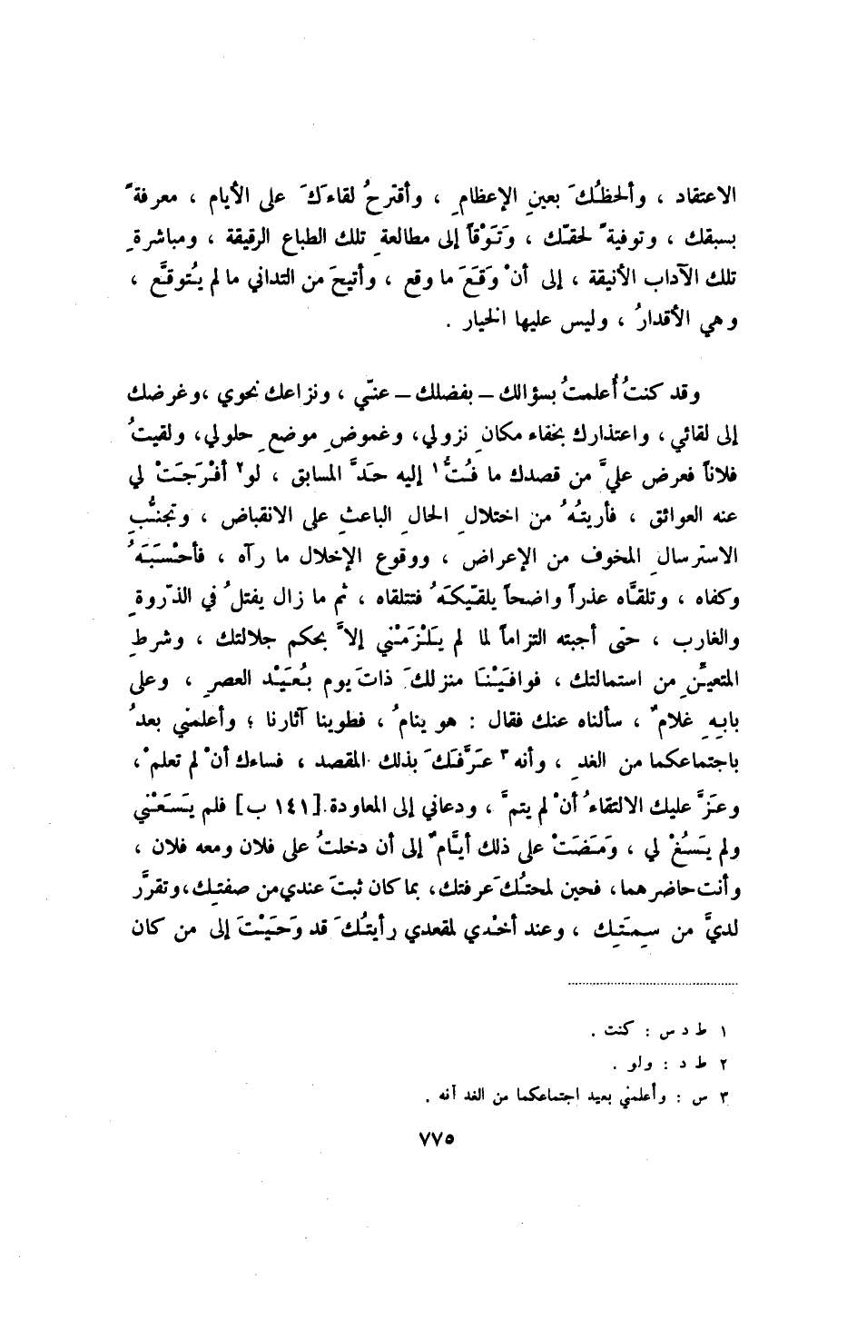 وقد كنت أعلمت بسؤالك - بفضلك - عني، ونزاعك نحوي، وغرضك إلى لقائي، واعتذارك بخفاء مكان نزولي، وغموض موضع حلولي، ولقيت فلاناً فعرض عليّ من قصدك ما فت (1) إليه حد المسابق، لو (2) أفرجت لي عنه العوائق، فأريته من اختلال الحال الباعث على الانقباض، وتجنب الاسترسال المخوف من الإعراض، ووقوع الإخلال ما رآه، فأحسبه وكفاه، وتلقاه عذراً واضحاً يلقيكه فتتلقاه، ثم ما زال يفتل في الذروة والغارب، حتى أجبته التزاماً لما لم يلزمني إلا بحكم جلالتك، وشرط المتعين من استمالتك، فوافينا منزلك ذات يوم بعيد العصر، وعلى بابه غلام، سألناه عنك فقال: هو ينام، فطوينا آثارنا؛ وأعلمني بعد باجتماعكما من الغد، وأنه (3) عرفك بذلك المقصد، فساءك أن لم تعلم، وعز عليك الالتقاء أن لم يتم، ودعاني إلى المعاودة [141ب] فلم يسعني ولم يسغ لي، ومضت على ذلك أيام إلى أن دخلت على فلان ومعه فلان وأنت حاضرهما، فحين لمحتك عرفتك، بما كان ثبت عندي من صفتك، وتقرر لدي من سمتك، وعند أخذي لمقعدي رأيتك قد وحيت إلى من كان
