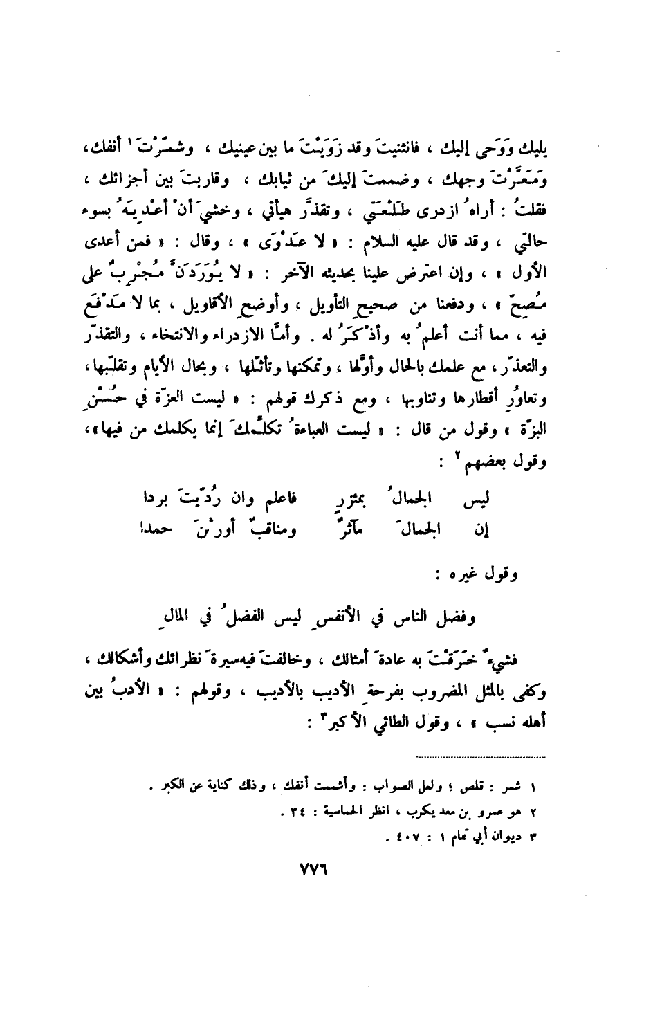 وفضل الناس في الأنفس ليس الفصل في المال ... فشيء خرقت به عادة أمثالك، وخالفت فيه سيرة نظرائك وأشكالك، وكفى بالمثل المضروب بفرحة الأديب بالأديب، وقولهم: " الأدب بين أهله نسب "، وقول الطائي الأكبر (3) :