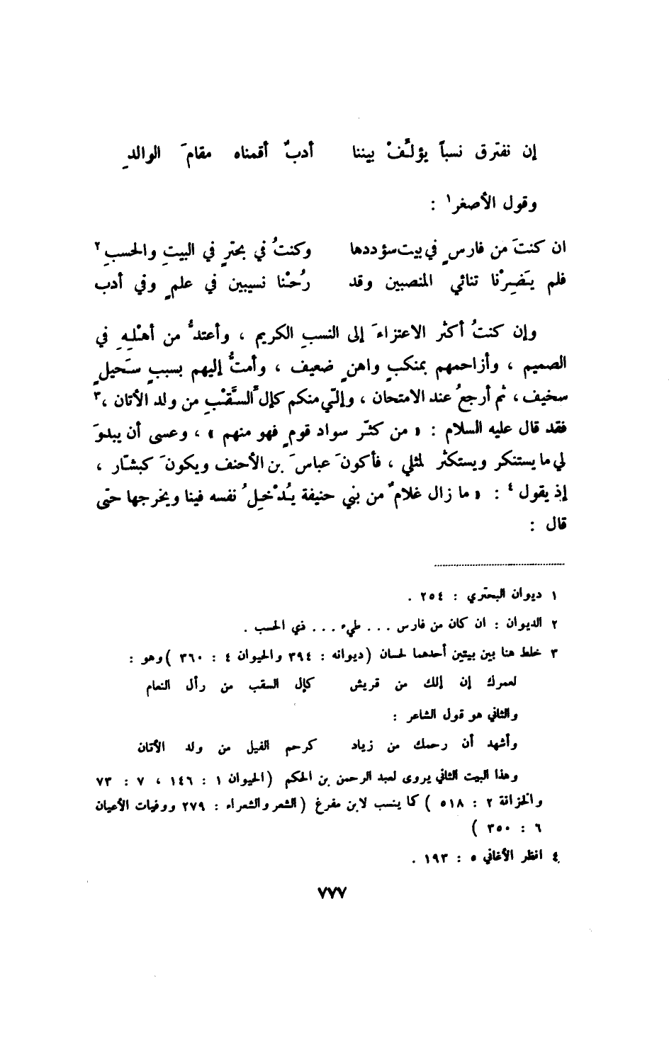 فلم بضرنا تنائي المنصبين وقد ... رحنا نسيبين في علمٍ وفي أدب وإن كنت أكثر الاعتزاء إلى النسب الكريم، وأعتد من أهله في الصميم، وأزاحمهم بمنكب واهن ضعيف، وأمت إليهم بسببٍ سحيل سخيف، ثم أرجع عند الامتحان، وإلي منكم كإل السقب من ولد الأتان، (3) فقد قال عليه السلام: " من كثر سواد قومٍ فهو منهم "، وعسى أن يبدو لي ما يستنكر ويستكثر لمثلي، فأكون عباس بن الأحنف ويكون كبشار إذ يقول (4) : " ما زال غلام من بني حنيفة يدخل نفسه فينا ويخرجها حتى قال: