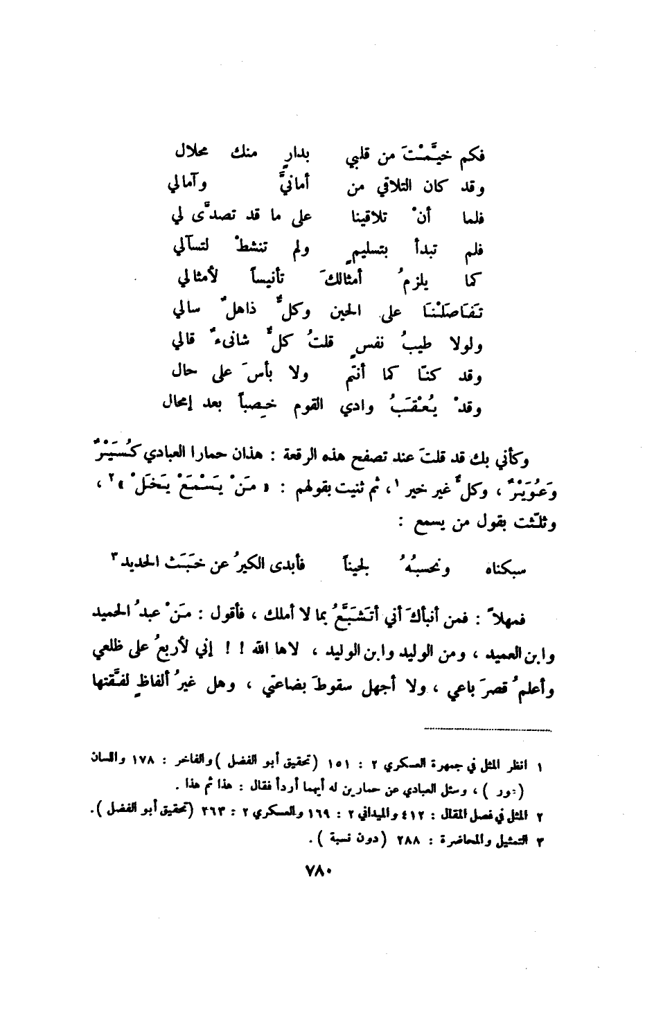 فلم تبدأ بتسليمٍ ... ولم تنشط لتسآلي كما يلزم أمثالك تأنيساً لأمثالي ... تفاصلنا على الحين وكل ذاهل سالي ... ولولا طيب نفس قلت كل شانئ قالي ...