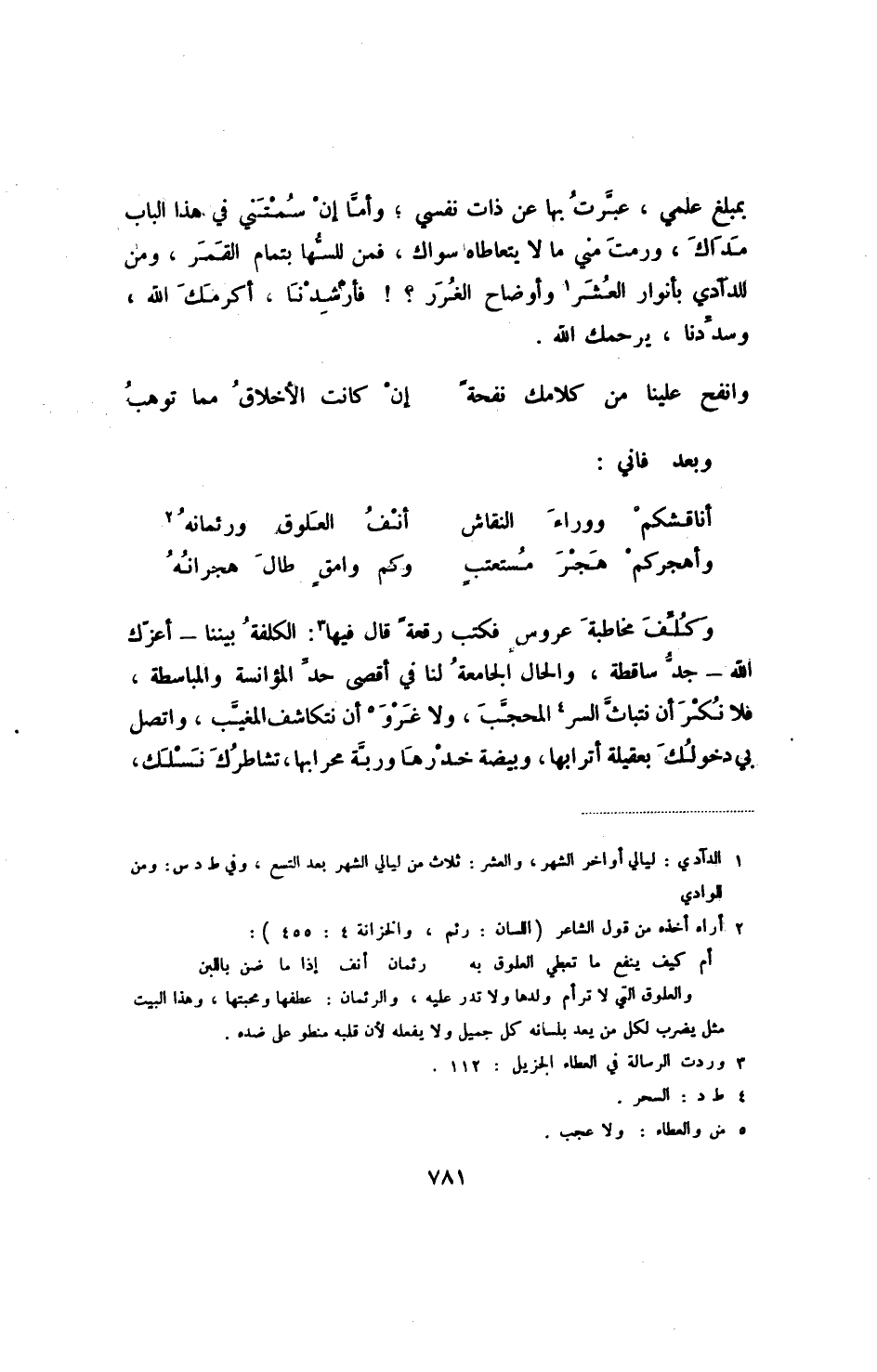 وأهجركم هجر مستعتبٍ ... وكم وامق طال هجرانه وكلف مخاطبة عروسٍ فكتب رقعة قال فيها (3) : الكلفة بيننا - أعوزك الله - جد ساقطة، والحال الجامعة لنا في أقصى حد المؤانسة والمباسطة، فلا نكسر أن نتباث السر (4) المحجب، ولا غرو (5) أن نتكاشف المغيب، واتصل بي دخولك بعقلية أترابها، وبيضة خدرها وربة محرابها، تشاطرك نسلك،